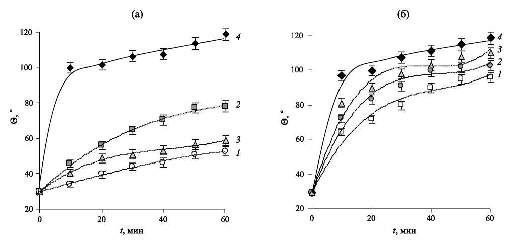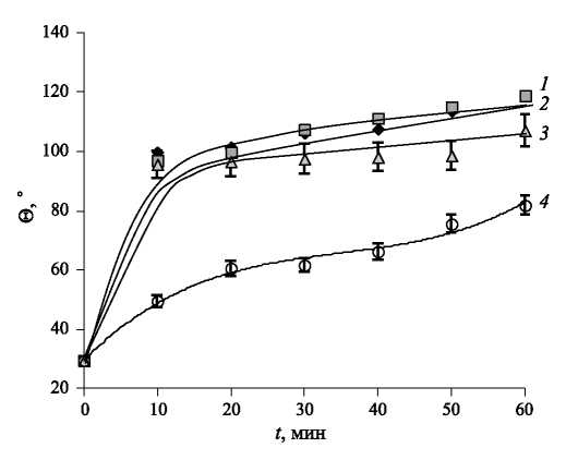 Рис. 4. Влияние природы кислоты на величину краевого угла материала, адгезированного на стеклянную подложку. Система: 0.1 М водный Yb(III) (рН 5.3) / 0.1 М раствор Д2ЭГФК (1), стеариновой кислоты (2), миристиновой (3) и олеиновой (4) кислот в гептане.
