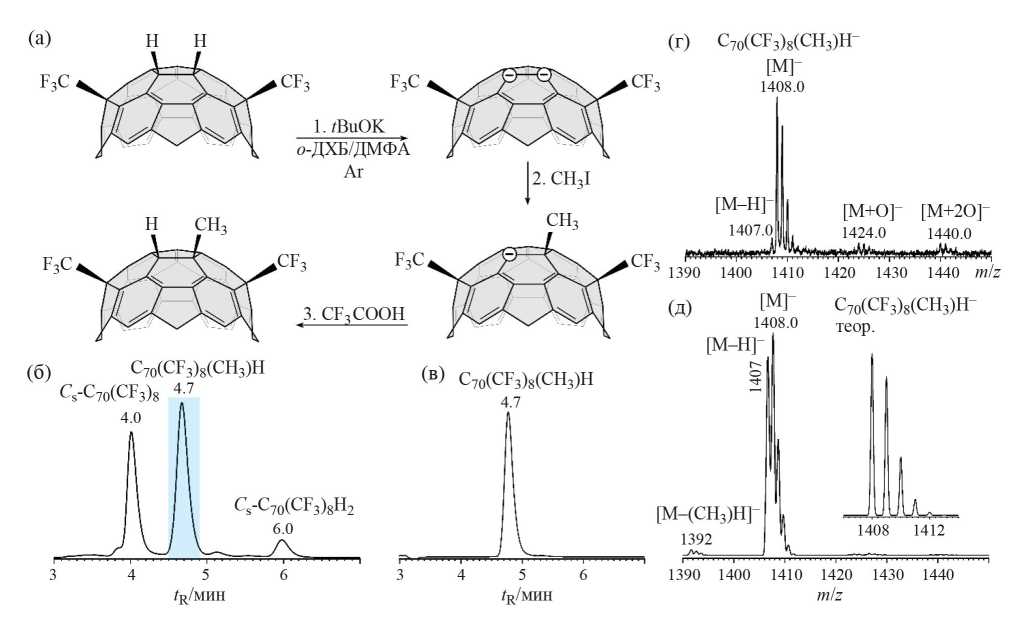 Рис. 1. Схема получения C70(CF3)8(CH3)H (показан фрагмент молекулы Cs-C70(CF3)8 с околоэкваториальной [5, 6]-связью) (а), хроматограмма (Cosmosil Buckyprep 4.6 мм в. д. × 25 см, толуол, 1 мл/мин, 290 нм) реакционной смеси (б) и выделенной фракции (в), масс-спектры отрицательных ионов МАЛДИ (г) и ХИАД (д) для C70(CF3)8(CH3)H.