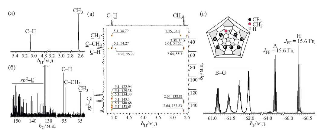 Строение синтезированного производного C70(CF3)8(СH3)H было подтверждено данными одномерной (1Н,13С,19F) и двумерной корреляционной (1H–13C HMBC) спектроскопии ЯМР (рис. 2). В спектре ЯМР 1H присутствуют два немного уширенных синглетных сигнала, соответствующие каркасному атому водорода (δH 5.10 м. д.) и трем эквивалентным атомам водорода метильной группы (δH 2.64 м. д.). В сравнении с исходным Сs-C70(CF3)8Н2 (δH 5.61 м. д.) химический сдвиг каркасного атома водорода сдвинут в область сильного поля на 0.5 м. д. В спектре ЯМР 19F присутствуют два характерных квартета при δF –64.21 (JFF = 15.6 Гц) и –66.30 (JFF = 15.6 Гц) м. д., соответствующие двум терминальным CF3 группам. В более сильном поле находятся частично перекрывающиеся резонансы шести групп CF3 (мультиплетные сигналы при δF –61.98, –61,75, –61.46, –61.17 м. д.). Наличие двух квартетов в спектре ЯМР 19F в сравнении с Сs-C70(CF3)8 (один квартет при δF –65.74 м. д. с JFF = 16.1 Гц) и Сs-C70(CF3)8Н2 (один квартет при δF –66.30 м. д. с JFF = 15.8 Гц) свидетельствует об отсутствии симметрии в молекуле. Суммарная интегральная интенсивность всех сигналов в спектре ЯМР19 F C70(CF3)8(СH3)H подтверждает наличие 8 групп CF3. На рис. 2г приведено отнесение обнаруженных резонансов терминальных групп CF3, полученное с привлечением данных квантово-химического моделирования, аналогично работе [15, 20]. В спектре ЯМР 13C присутствуют 60 сигналов sp2-гибридизированных атомов углерода фуллеренового каркаса, а также три синглетных сигнала в sp3-области, соответствующие атомам углерода, несущим функциональные группы (δC 54.26 и 55.30 м. д.), и атому водорода метильной группы (δC 34.82 м. д.). Однозначное отнесение всех сигналов в одномерных спектрах ЯМР 1Н и 13С было сделано при детальном анализе двумерного корреляционного спектра ЯМР 1H–13C HMВC (рис. 2в).