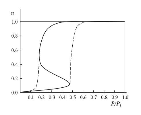 Рис. 4. Зависимость α(P/Ps) с гистерезисом.