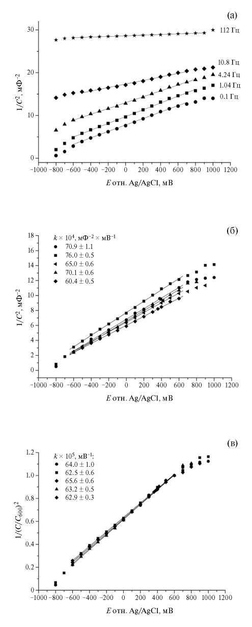 На рис. 2б приведены зависимости 1/С2(E) для пяти образцов одной серии. Линейную регрессию проводили в диапазоне потенциалов от –600 до 600 мВ, поскольку при E>600 мВ и E<–600 мВ наблюдались небольшие отклонения от линейной зависимости. Значения коэффициентов (k) приведены на рисунке. Разброс в величине емкости для образцов при E=600 мВ составлял 0.28–0.32 мФ (~15%), что связано с вариациями площади поверхности, и приводит к заметному разбросу значений коэффициента k. Для учета геометрического фактора проведена нормировка зависимости 1/С2(E) на величину емкости при потенциале E=600 мВ (С/С600). После нормировки (рис. 2в) разброс коэффициентов наклона для разных образцов одной серии значительно уменьшился. Коэффициент нормированной зависимости может использоваться для неразрушающей диагностики оксидного слоя в пористых образцах Ta/Ta2O5. Его аномальное значение, как и необычный вид нормированной зависимости 1/(С/С600)2 от потенциала, может быть признаком аномалий в составе и структуре оксидного слоя.