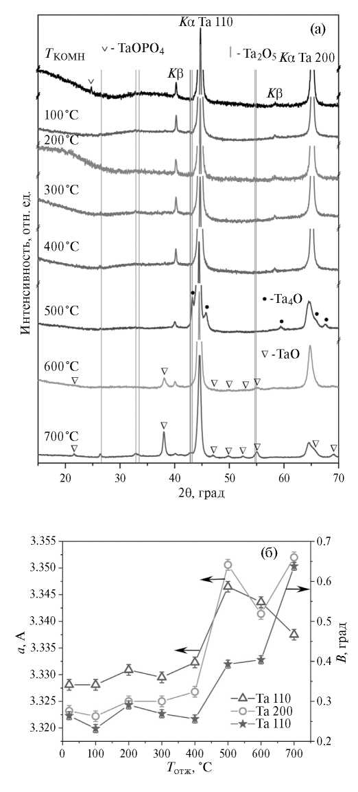 Отжиги при температурах 100–400°С не приводят к значительным изменениям фазового состава. Исчезает фаза TaO∙PO4 и немного возрастает интенсивность рефлексов кристаллического оксида Ta2O5. Наблюдается сдвиг линий тантала в сторону меньших углов, что связано с увеличением параметра решетки из-за растворения в нем кислорода (рис. 4б). Растворение кислорода также способствует уширению линии 110. Искажения решетки при внедрении атомов кислорода приводят к тому, что параметры, определенные для разных плоскостей отражения, отличаются. Изменения на дифрактограммах свидетельствуют об увеличении концентрации внедренных атомов кислорода с ростом температуры отжига. В тантале может раствориться до 5 ат. % кислорода, при этом параметр решетки тантала возрастает до ~3.34 Å [23]. Поскольку все отжиги проводились в среде аргона, то насыщение тантала кислородом идет за счет кислорода оксидной пленки, которая, в свою очередь, обедняется кислородом. Полученные результаты согласуются с литературными данными [22].