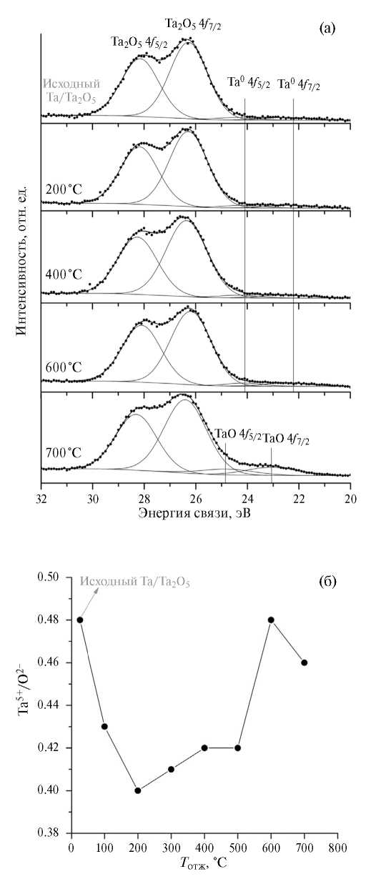 Таким образом, наблюдается постепенное насыщение тантала кислородом и формирование сначала субоксида (Ta4O), а затем оксида (TaO) на границах тантал/оксид. Температура кристаллизации аморфного Ta2O5 составляет 700°С (рис. 4а), что соответствует литературным данным [25].