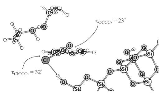 На границе раздела фаз эффективность каталитического процесса связана с затратами энергии на образование геометрически реакционноспособной структуры водородно-связанного комплекса, что обусловлено благоприятным расположением функциональных групп в основном состоянии. Для общего понимания взаимодействия водородно-связанной системы с поверхностными группами твердого катализатора-адсорбента нужны экспериментальные подтверждения факта управления процессом через изменения структуры и свойства. Нами была проведена серия экспериментов для системы бензоилхлорид–спирт [12]. Интерес к системе был обусловлен геометрическими характеристиками молекулы бензоилхлорида. Он хуже реагирует в любых условиях [30–32]. Появление третьей молекулы R2-OH не приводит к образованию предреакционного водородно-связанного комплекса. В переходном состоянии атому хлора необходимо преодолеть отталкивание от π-электронов бензольного кольца. И только прямое включение в процесс макропористого неплоского адсорбента силохрома СХ-1 с гидроксильными группами активирует тримолекулярный механизм за счет его структурно-энергетических характеристик даже в разбавленных растворах и существенно повышает выход продукта (табл. 2). В силовом поле неплоского адсорбента происходит изменение геометрии адсорбата, что компенсирует часть энергетических затрат, необходимых для изменения торсионных углов. С одной стороны, адсорбент притягивает молекулы своей ОН-группой для образования водородной связи OH···Cl (rH···Cl = 2.31 Å, ∠OH···Cl = 174°) и CH···O (rH···O = 2.58 Å, ∠CH···O = 152°). С другой стороны, дисперсионные силы взаимодействуют с бензольным кольцом бензоилхлорида. Плоская молекула бензоилхлорида уже в основном состоянии становится неплоской (рис. 7). Атомы кислорода и хлора выходят из плоскости бензольного кольца на 23° и 32° соответственно. В переходном состоянии они изменяются до 6° и –121°, соответственно. Бензоилхлорид не претерпевает значительные конформационные изменения при переходе из основного в переходное состояние. В результате ΔG≠ снижается примерно на 40 кДж/моль. Таким образом, силохром СХ-1 создает новый путь протекания реакции через стадию образования тримолекулярного водородно-связанного комплекса. Результаты эксперимента подтвердили найденный механизм управления реакцией посредством водородных связей.
