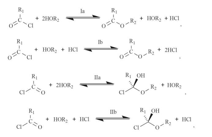 В неполярных средах реакции замещения по одинарным связям углерод–хлор и присоединения к кратным связям углерод–кислород нуклеофильных реагентов (Н2О, ROH, RCOOH) предполагает общий характер поведения ацилхлоридов [1–3]. Система ацилхлорид–гидроксилсодержащее соединение может быть представлена одно- и многостадийным процессами