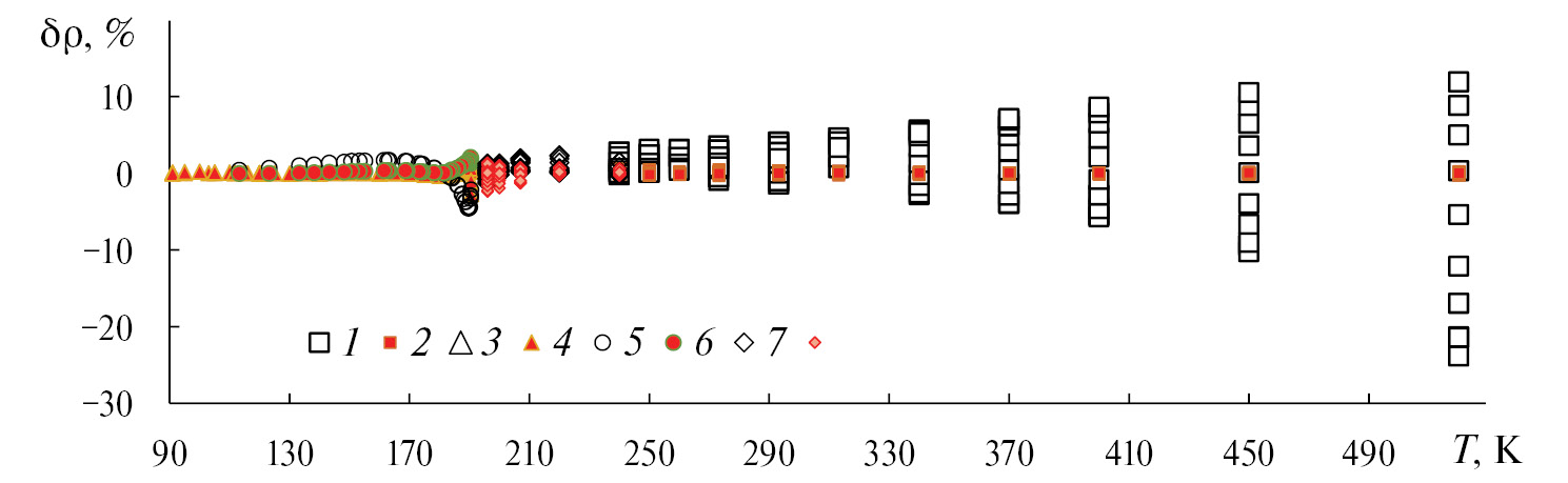 Данные о плотности метана описываются ЕФУС (32) с существенно меньшей неопределенностью, чем уравнение КУС [15, 84] (рис. 2 и 3). Это касается как области давлений 8–30 МПa (рис. 2, маркеры 10) и температур 100–520 К (рис. 3). Особенно это заметно в интервале 240–520 К, где отклонения, , расчетных значений, , по КУС от данных [37] достигают 23% (рис. 3, маркеры 1), тогда как все значения, , рассчитанные на основе ЕФУС (32), находятся в пределах ±0.45%.
