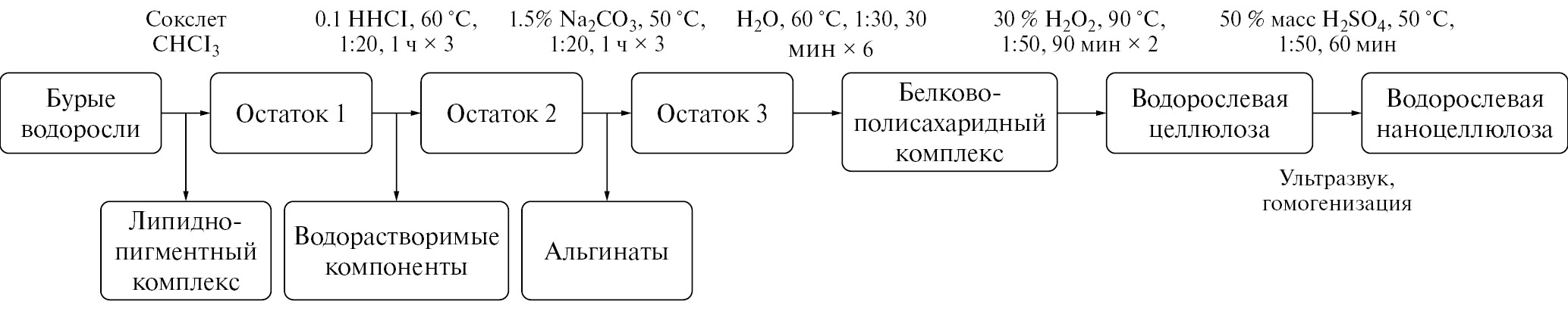 Рис. 1. Схема получения водорослевой целлюлозы и наноцеллюлозы.
