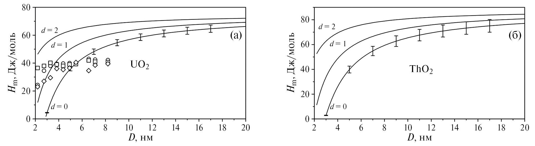 Сопоставление результатов расчетов Tm(D) и Hm(D) для отдельно стоящих наночастиц (рис. 1 и 2) и наночастиц в виде зерен нанокристаллических диоксидов UO₂ и ThO₂ (рис. 3 и 4) показывает, что размерный эффект существенно меньше в нанокристаллических диоксидах актинидов, чем в отдельно стоящих наночастицах. Это связано с тем, что из-за наличия межзеренных границ среднеквадратичное смещение атомов от их положения равновесия, обусловленное тепловыми колебаниями, у поверхностных атомов зерен меньше, чем у поверхностных атомов отдельно стоящих наночастиц такого же характерного размера. Следовательно, в соответствии с критерием плавления Линдеманна (1) плавление нанокристаллических структур происходит при более высоких температурах, чем плавление соответствующих отдельно стоящих наночастиц.