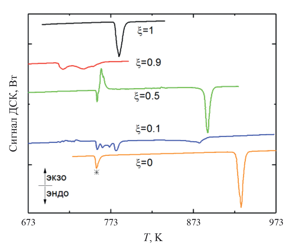В частности, CsCl претерпевает фазовый переход в исследуемой области температур. По этой причине термодинамические характеристики фазового перехода в CsCl необходимо учитывать при дальнейшем расчете. Пик на ДСК-кривой, соответствующий этому переходу из низкотемпературной (b. c.c, Pm3m) в высокотемпературную (f. c. c., Fm3m) модификацию CsCl, виден на рис. 1 (ξ = 0) слева от пика плавления CsCl. Определенные в данной работе температура, Ttr = (748.6 ± 0.8) К, и энтальпия, ΔtrH°CsCl = (3.09 ± 0.04) кДж моль–1, этого фазового перехода неплохо согласуются с литературными данными [7–10].