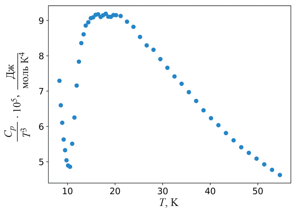 В области низких температурах у исследованного стекла на кривой Cp (T) обнаружен бозонный пик с широким максимумом около 17 K, что согласуется с литературными данными для аналогичных образцов.