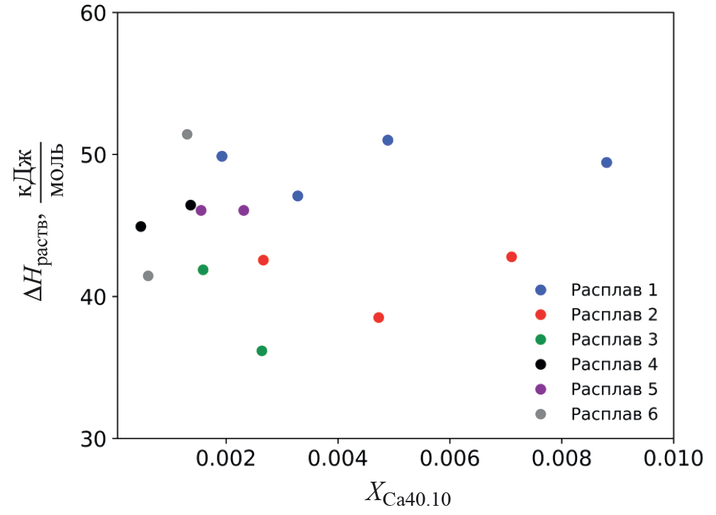 Для того, чтобы убедиться, что все эксперименты проводились в приближении бесконечно разбавленного раствора, нами была построена зависимость энтальпии растворения стекла Ca40.10 от мольной доли растворенного вещества в свинцово-боратном расплаве (см. рис. 5). Видно, что какая-либо систематическая зависимость теплового эффекта от общего количества исследуемого образца в свинцово-боратном растворителе отсутствует, поэтому все значения были усреднены. Таким образом, энтальпия растворения стекла Ca40.10 в свинцово-боратном расплаве при 800°C/1073.15 К составила 45.0 ± 2.3 кДж/моль.