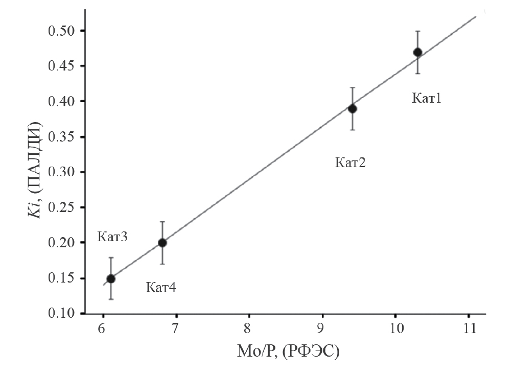 Как видно из рис. 6, наблюдается хорошее соответствие величины атомного соотношения Mo/P, полученного методом РФЭС (см. табл. 1) и критерия стабильности KI по данным ПАЛДИ, что говорит о возможности применения последнего для характеристики гетерогенных композиций на основе ФМК. Следует, однако, отметить, что эту величину можно использовать лишь в сравнительных экспериментах, так как ее абсолютное значение зависит от условий проведения анализа.