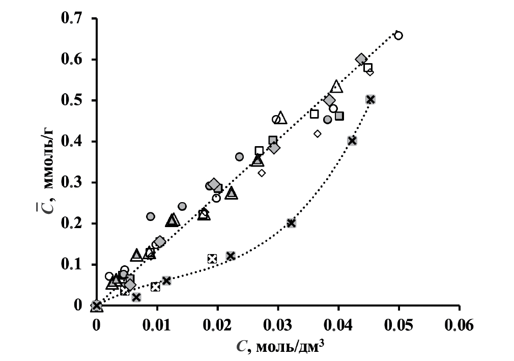 Рис. 2. Изотермы необменной сорбции триптофана из индивидуальных растворов и смесей с другими веществами на анионообменнике АВ-17-2П в Cl-форме (пустые значки)и NO3форме (серые значки) ○● – Трп индив., Δ ▲ – Трп + АК, □ ■ – Трп + NaCl / NaNO3, ◊ ♦ – Трп + СаСl2 / Са(NO3)2), ☒  – Трп + НСl / HNO3.