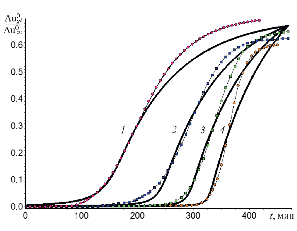 Кинетическая модель (3), (4) описывает основные наблюдаемые эффекты, а именно наличие продолжительного периода индукции и увеличение периода индукции с ростом начальной концентрации исходного реагента Au3+.