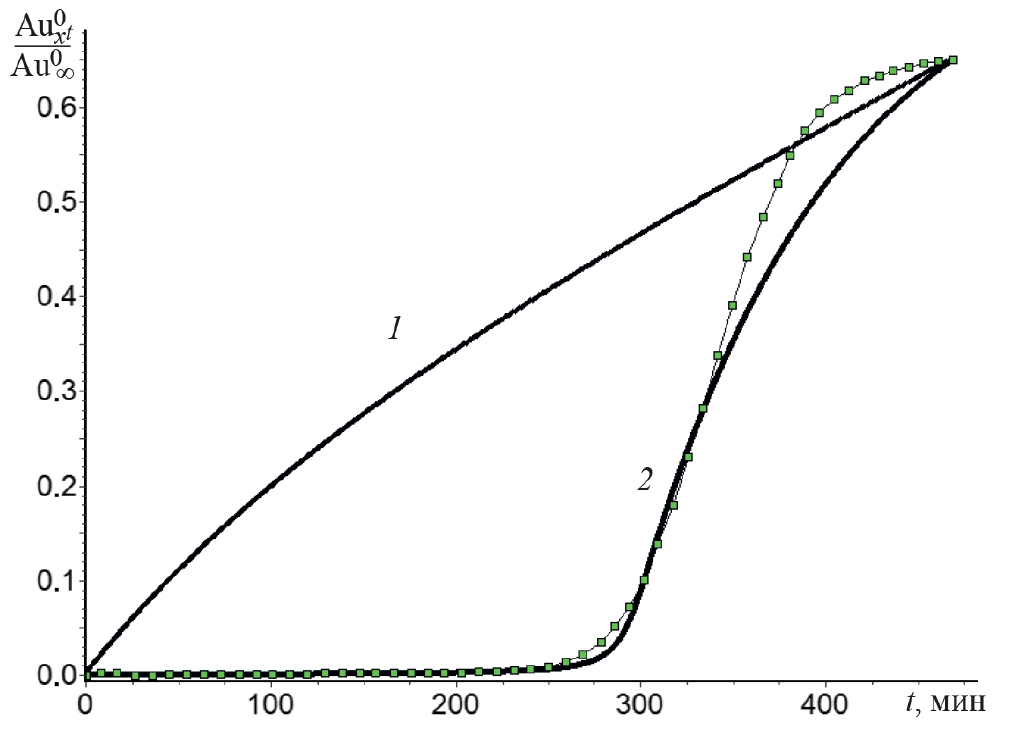 Рис. 2. Кинетические кривые накопления дисперсной фазы золота при отсутствии (кривая 1, k2 = 0) и наличии процесса окисления Aux0 действием Au3+ (кривая 2, k2 = 3 × 104 M–1 мин–1, экспериментальные данные – линия с точками).
