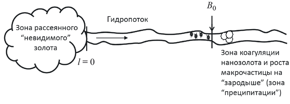 На схеме 1 показано формирование “россыпи” макрочастиц в процессе образования и функционирования гидропотока, содержащего рассмотренные выше формы золота. Важным представляется использование для описания системы указанных выше особенностей восстановления ионных форм до металлического золота и реакции их взаимного превращения. Модель предполагает наличие обширной зоны рассеянного “невидимого” золота и переноса его в гидропоток. При этом в гидропотоке осуществляется весь комплекс реакций, описанных выше ((1), (2)).
