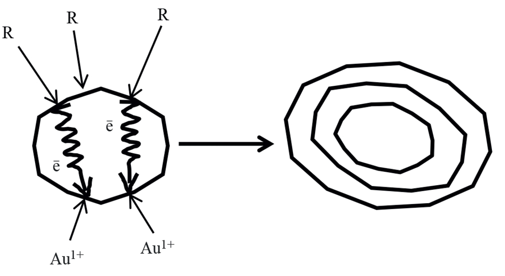 С учетом наблюдаемых кинетических эффектов можно предложить кинетическую схему, которая включает следующие стадии в едином кинетическом механизме, описывающей все наблюдаемые явления. Механизм включает восстановление (в случае экспериментальных результатов [20] это лимонная кислота) сильного окислителя Au3+ до формы Au1+ с последующим восстановлением этого иона до металлического состояния. При этом Au3+ как сильный окислитель способен окислить Au0 до Au1+. Ионы золота Au3+ и Au1+ очень сильные окислители. Стандартные окислительно-восстановительные потенциалы равны: Au3+/Au0 = 1.5 В, Au1+/Au0 = 1.7 В (для сравнения: окислительная способность кислорода характеризуется стандартным окислительно-восстановительным потенциалом 1.23 В). В присутствии органического или неорганического восстановителя в системе протекают следующие химические реакции: