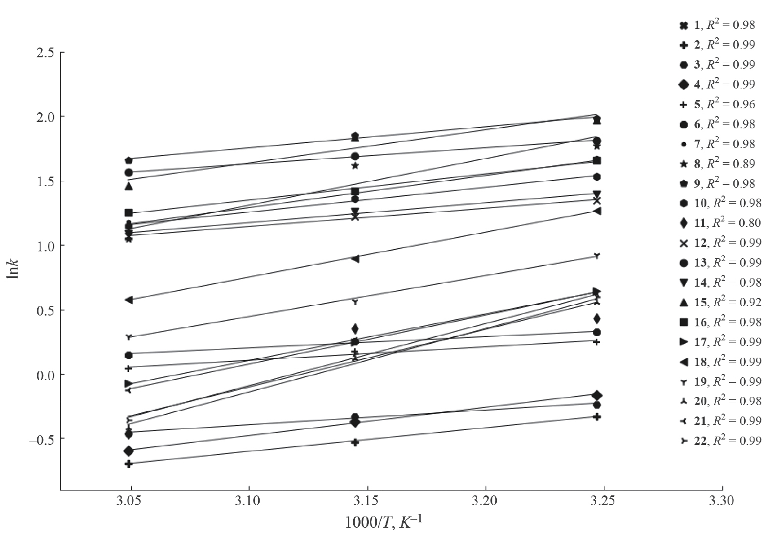 Рис. 1. Зависимости lnk от 1000 / Т (состав элюента ацетонитрил–вода 50:50).