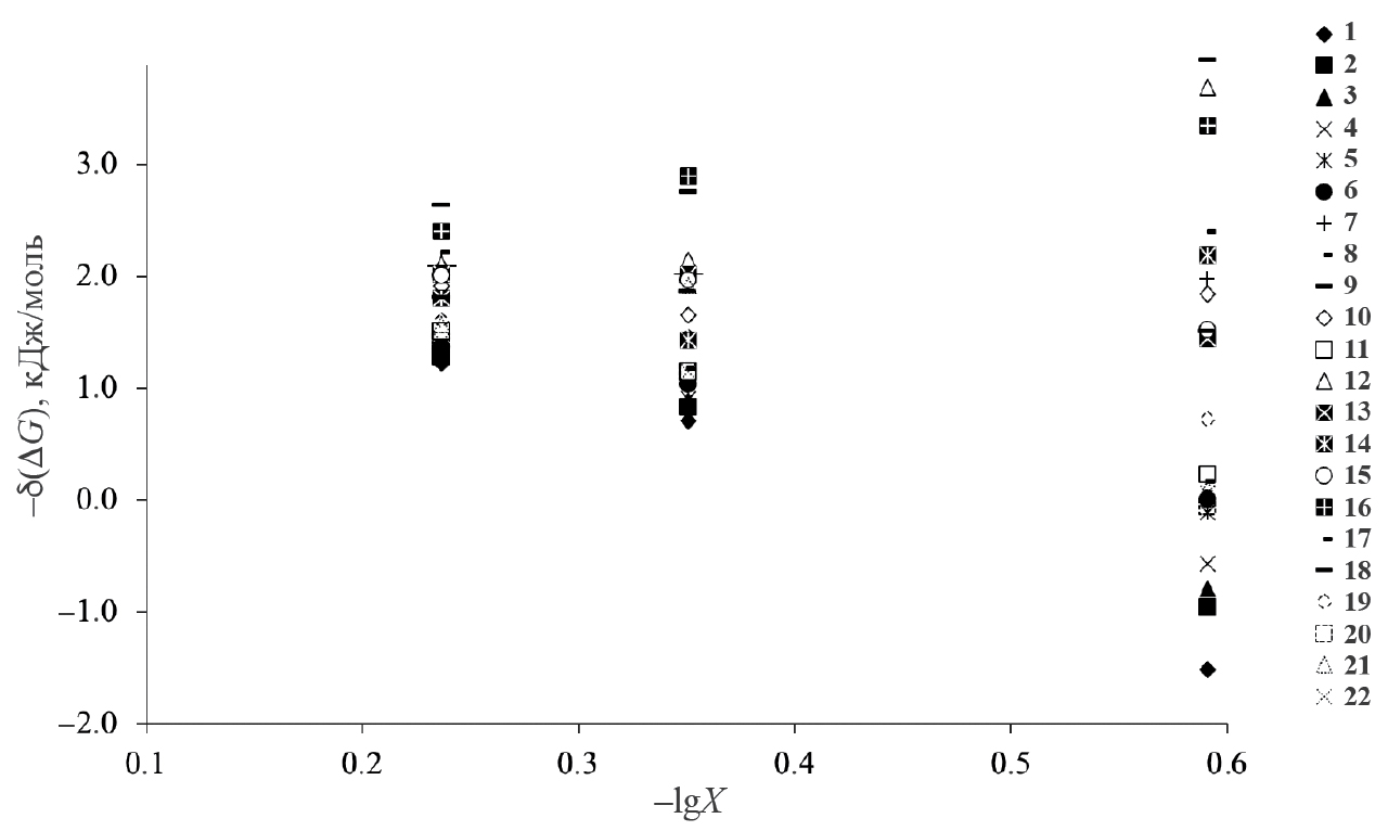 Дополнительные сведения о влиянии изменения структуры на удерживание в ОФ варианте ВЭЖХ можно получить на основании изменения величин дифференциальных мольных энергий Гиббса δ (ΔG) или удерживания относительно какого-либо вещества, стандартного для данного класса соединений [2]. Из представленных в табл. 3 значений δ (ΔG) и удерживания исследованных соединений, определенных относительно хинолина (r), следует, что сорбция веществ 1–6 и 17–22 несущественно изменяется по сравнению с удерживанием хинолина: при концентрации ацетонитрила, равной 50%, значения r оказываются либо меньше, либо чуть больше 1, а величина δ (∆G) практически не превышает 1.5 кДж/ моль, что, очевидно, является результатом преимущественного вклада в удерживание основного хинолинового фрагмента. При этом влияние относительно больших (по сравнению с хинолином) значений параметров, ответственных за дисперсионные взаимодействия этих веществ с сорбентом, нивелируется взаимодействием соответствующих функциональных групп и заместителей с компонентами элюента. Следует обратить внимание на уже отмеченный выше факт присутствия в молекулах указанных веществ гидроксильной группы в α-положении по отношению к атому азота, усиливающей взаимодействие этих сорбатов с элюентом. Косвенным подтверждением данного предположения является примерно в 2 раза большая сорбция веществ 7–16 (за исключением вещества 11 с пиридилом в положении 2), не содержащих гидроксильной группы, относительно хинолина.