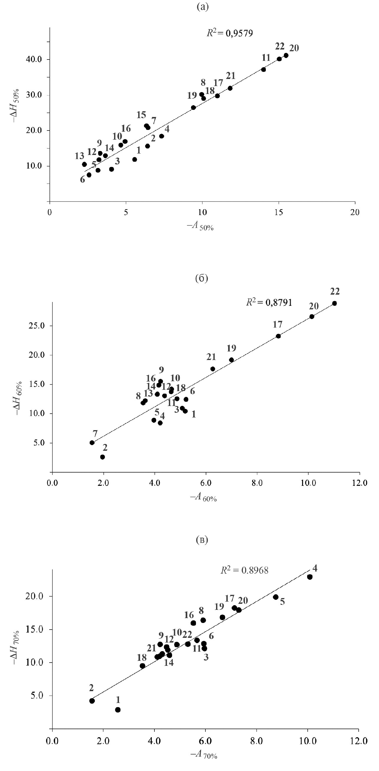 О влиянии количественного состава элюента на сорбцию исследованных гетероциклов свидетельствует также анализ энтальпийно-энтропийных зависимостей процесса перехода сорбатов из водно-ацетонитрильных растворов в фазу октадецилсиликагеля. Причиной возникновения энтальпийно-энтропийной компенсации при сорбции, как известно, является тот факт, что изменение энтальпии, то есть увеличение энергетической составляющей процесса взаимодействия молекул сорбата с поверхностью сорбента в результате изменения их строения, компенсируется энтропийной составляющей, то есть увеличением степени локализации молекул сорбата на поверхности сорбента. Из рис. 4 следует, что характер подобной зависимости для исследованных сорбатов оказывается несколько различным при изменении состава элюента – коэффициент соответствующей линейной аппроксимации изменяется от ~ 0.96 при 50% ацетонитрила, до ~ 0.88 и 0.90 при концентрации ацетонитрила 60 и 70%. Поскольку известно, что компенсационный эффект наблюдается для процессов, протекающих, как правило, по одному механизму [23, 24], полученные данные могут быть косвенным подтверждением изменения механизма удерживания гетероциклов с изменением состава элюента.
