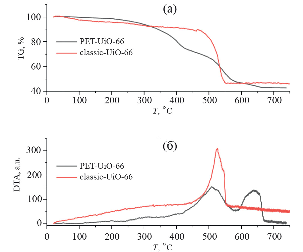 Из сопоставления кривых ТГА и ДТА (рис. 6) для материалов UiO-66, синтезированных на основе ПЭТ и по “классической” методике, следует, что для материала PET-UiO-66 область 200–420°С соответствует термодеструкции остаточных олигомеров ПЭТ. Первый максимум теплового эффекта (540°С), а также соответствующая ему область 420–600°C характерны как для материала PET-UiO-66, так и для образца classic-UiO-66, и соответствуют деструкции каркаса. Второй максимум теплового эффекта (640°С) и соответствующая ему область на кривой ТГА характерны только для материала PET-UiO-66. Они могут соответствовать окислению углерода, сформировавшегося при термодеструкции остаточных олигомеров, образующихся при деполимеризации ПЭТ. Исходя из изменения веса образца в процессе термического разложения, он содержит ~ 4.5% примеси остаточных олигомеров ПЭТ.
