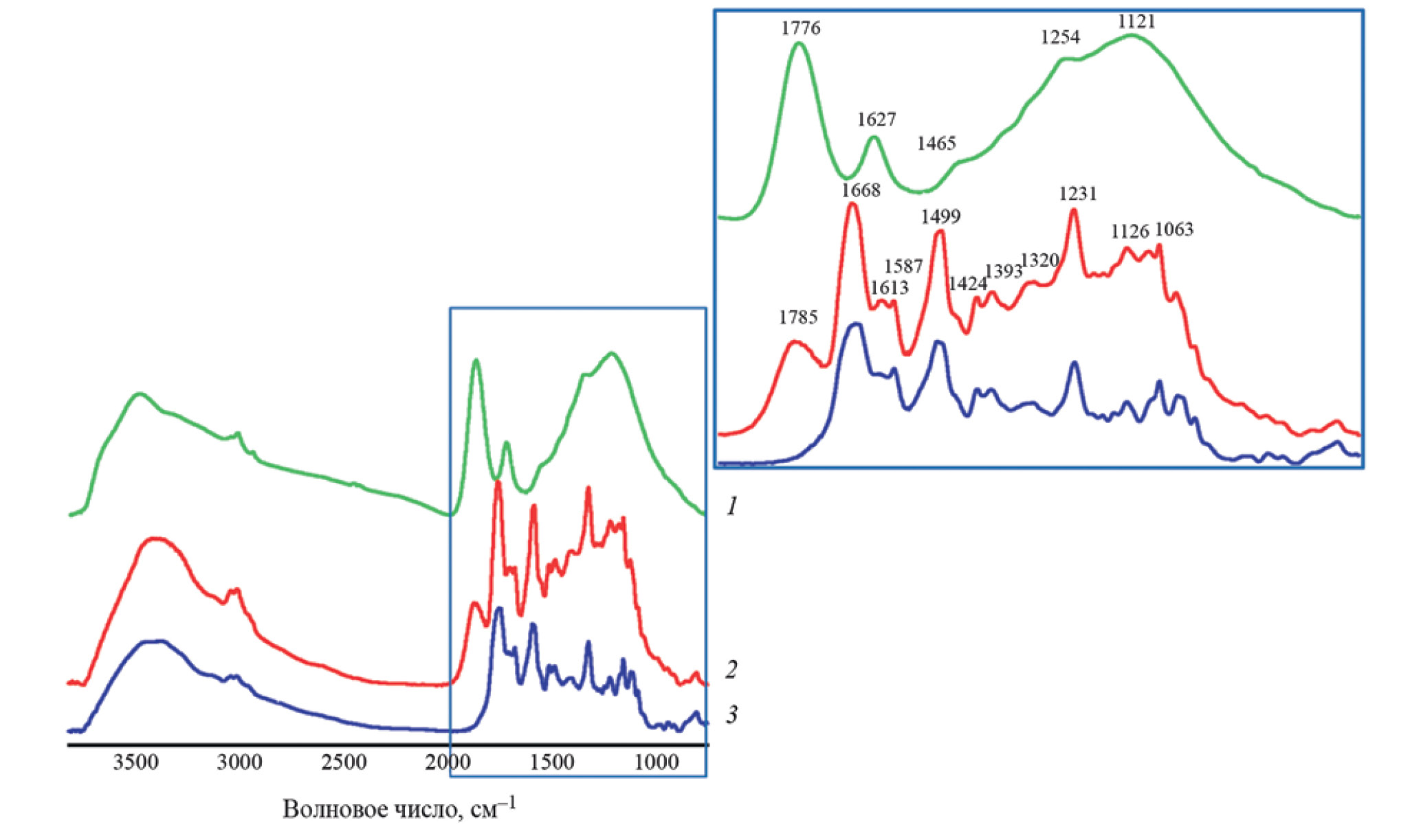 Рис. 3. ИК-спектры ДНА (1), комплекса ДНА-ванкомицин (2) и ванкомицина (3).