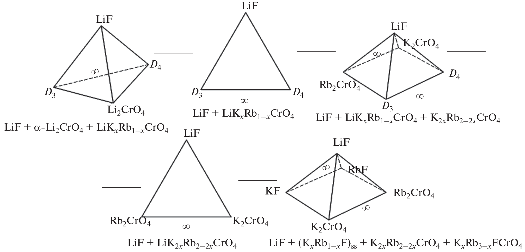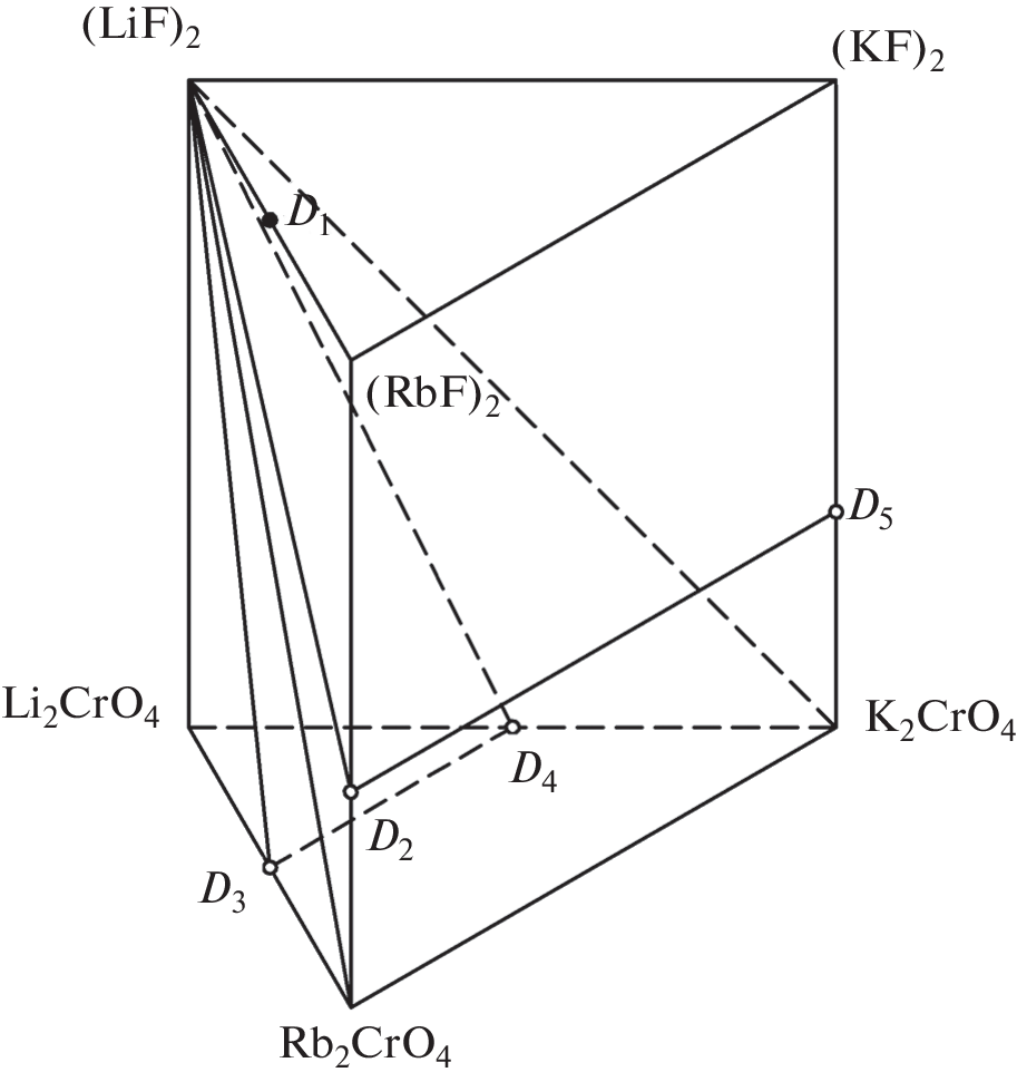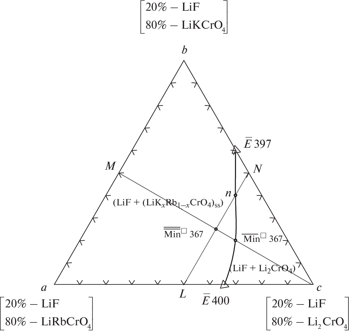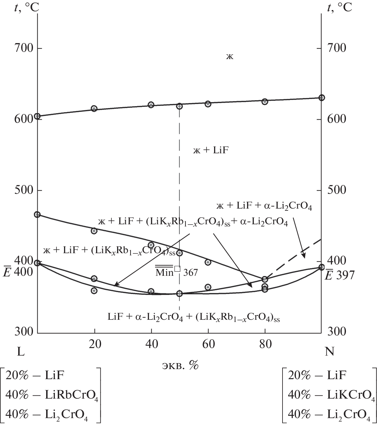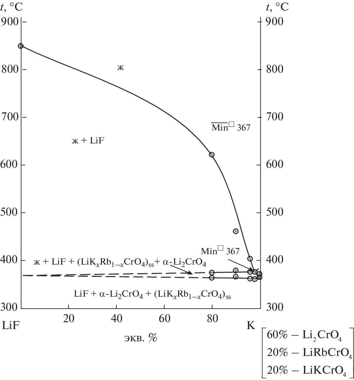 Here, phase equilibria in a quaternary reciprocal system comprised of fluorides and chromates of lithium, potassium, and rubidium was studied. The phase assemblage of the system was partitioned to stable simplices. The Li–Li2CrO4–LiRbCrO4–LiKCrO4 stable tetrahedron was selected as the subject matter of this study due to its undoubted scientific importance. The analysis of the boundary elements predicted, and the DTA experimental study of phase equilibria in the system proved, that monovariant phase equilibrium L ⇄ LiF + α-Li2CrO4 + (LiKxRb1 – xCrO4)ss is realized in the system, described by line Е 397–Е 400; the characteristics of the minimum point of this monovariant equilibrium (Min◻ 367) were elucidated. The mass balance of the phase reaction for this point is presented. A 3D model of the phase assemblage of the system was designed based on experimental data. The system preserves the continuity of (LiKxRb1 – xCrO4)ss solid solutions. The mixture whose composition corresponds to point Min◻ 367 has a relatively low melting temperature and can serve as a material for new fusible electrolytes in chemical current sources; it can also be of interest as an electrolytic bath for recovery of metals from melts.