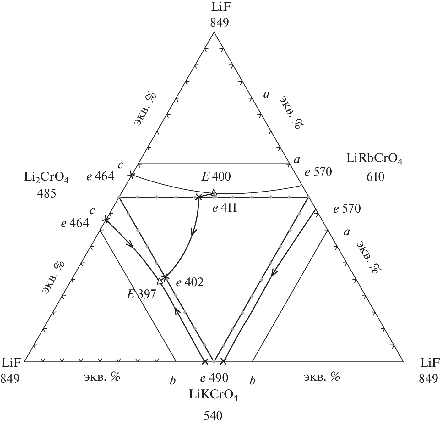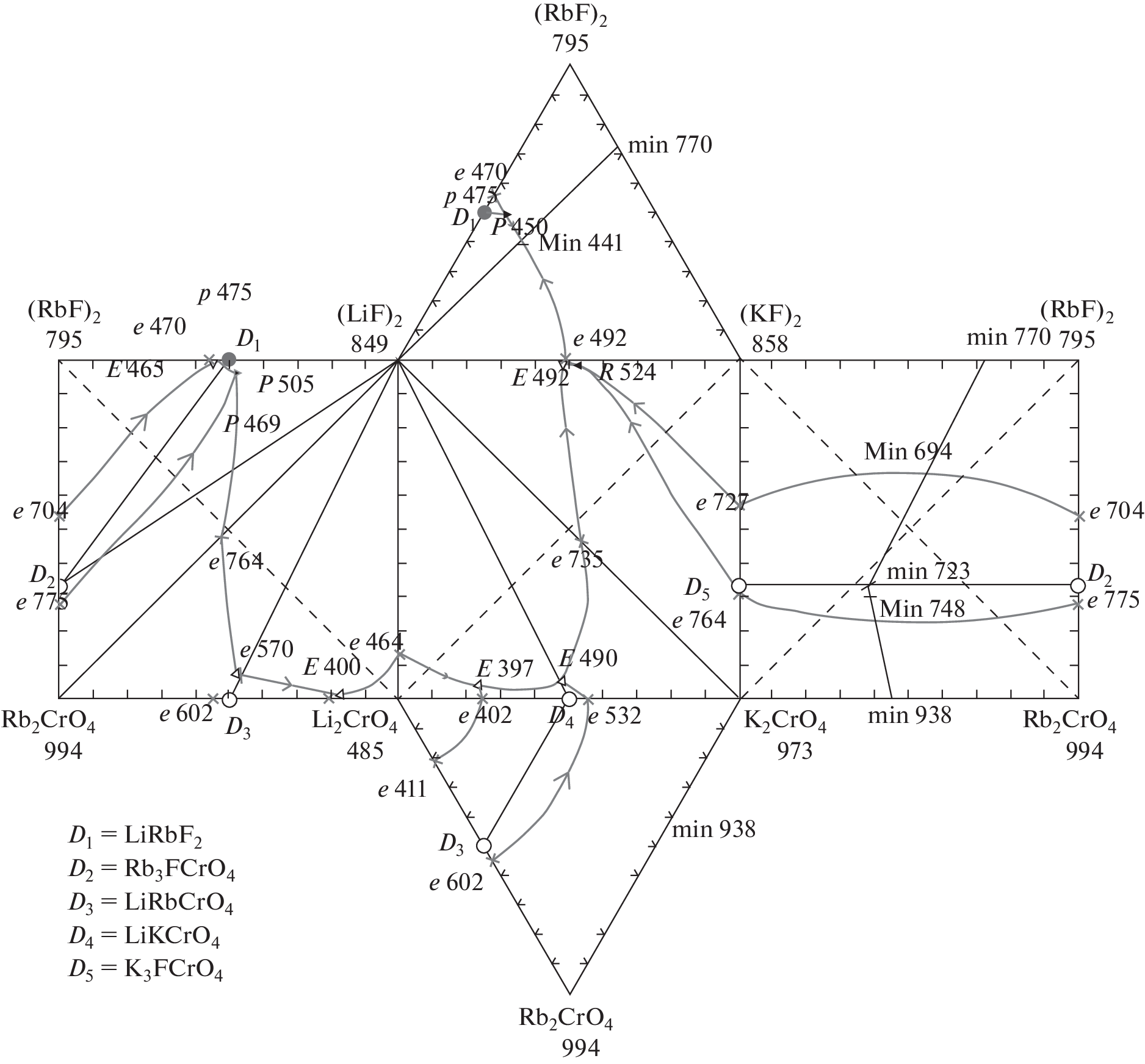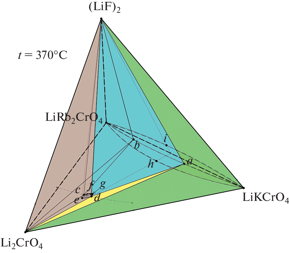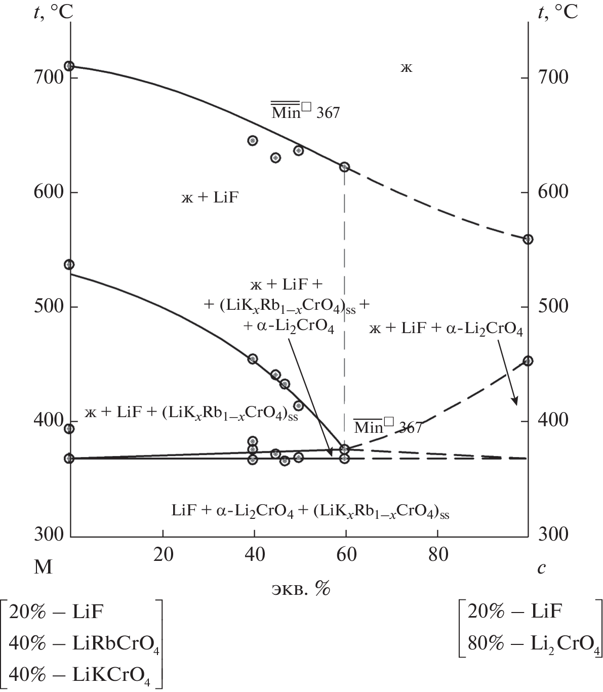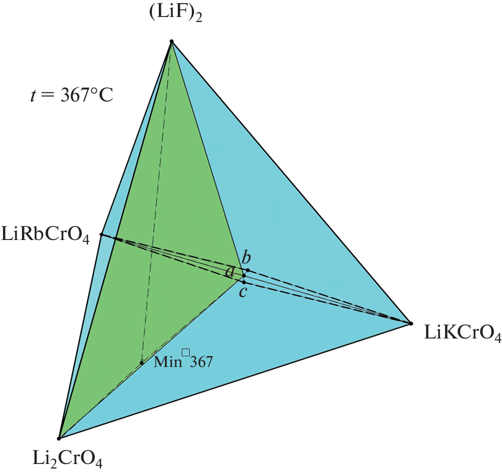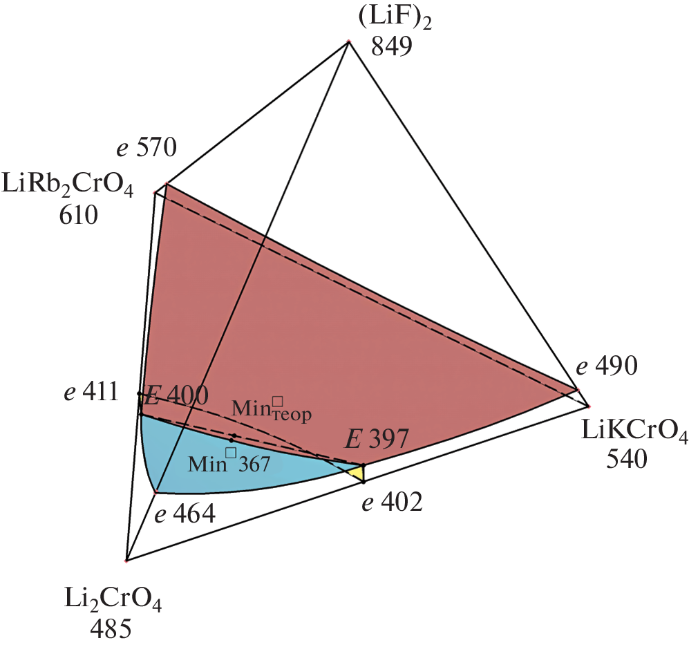 Here, phase equilibria in a quaternary reciprocal system comprised of fluorides and chromates of lithium, potassium, and rubidium was studied. The phase assemblage of the system was partitioned to stable simplices. The Li–Li2CrO4–LiRbCrO4–LiKCrO4 stable tetrahedron was selected as the subject matter of this study due to its undoubted scientific importance. The analysis of the boundary elements predicted, and the DTA experimental study of phase equilibria in the system proved, that monovariant phase equilibrium L ⇄ LiF + α-Li2CrO4 + (LiKxRb1 – xCrO4)ss is realized in the system, described by line Е 397–Е 400; the characteristics of the minimum point of this monovariant equilibrium (Min◻ 367) were elucidated. The mass balance of the phase reaction for this point is presented. A 3D model of the phase assemblage of the system was designed based on experimental data. The system preserves the continuity of (LiKxRb1 – xCrO4)ss solid solutions. The mixture whose composition corresponds to point Min◻ 367 has a relatively low melting temperature and can serve as a material for new fusible electrolytes in chemical current sources; it can also be of interest as an electrolytic bath for recovery of metals from melts.
