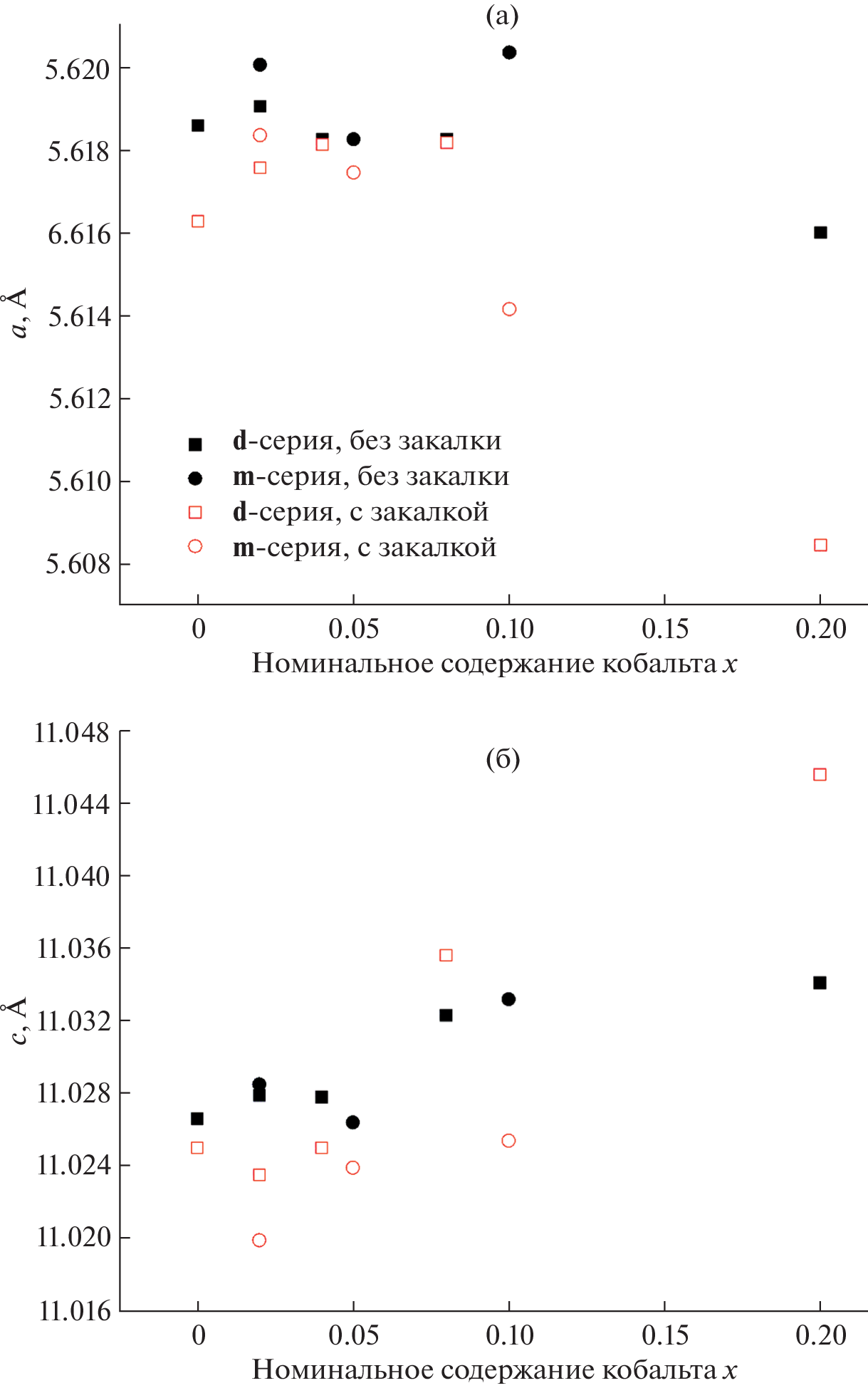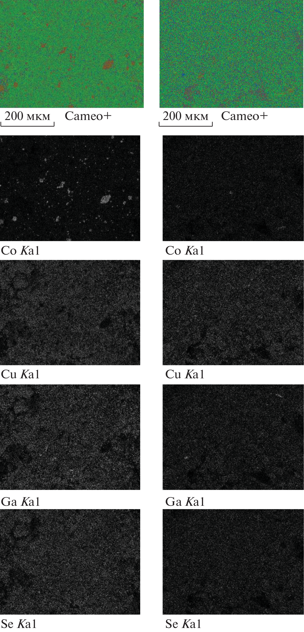 Получены две серии допированных кобальтом халькопиритов CuGa1 – xCoxSe2 и Cu1 – x/2Ga1 – x/2CoxSe2. Кобальт частично встраивается в структуру халькопирита, обеспечивая возникновение парамагнитных свойств, а частично остается в составе примесей селенидов кобальта. Применение высокотемпературной закалки позволяет добиться практически полного встраивания кобальта в образцах серии Cu1 – x/2Ga1 – x/2CoxSe2. В наиболее концентрированном образце Cu0.9Ga0.9Co0.2Se2 наблюдается возникновение значимого ферромагнетизма, в том числе при комнатной температуре.