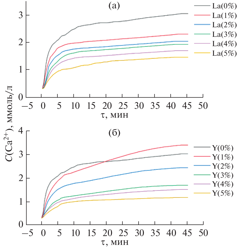 Substituted hydroxylapatites (HAs) containing various La3+ or Y3+ percentages were prepared. X‑ray powder diffraction, Four-transform IR spectroscopy, and optical spectroscopy verified the formation of substituted hydroxylapatites (La–HA and Y–HA). Inductively coupled plasma atomic emission spectrometry (ICP–AES) verified the presence of REE ions in the solids. Changes in the unit cell parameters of the prepared phases indicated that the REE ions substituted for Ca2+ ions in the hydroxylapatite structure. The lanthanum or yttrium percentage in precipitates increased in response to increasing REE salt concentration (within 1–5 wt %) in the initial solution as shown by chemical analysis; this brought about a decrease in the ratio Ca/P compared to the stoichiometric ratio (1.67). The solubility of the synthesized samples was studied, and it appeared that the cation-substituted hydroxylapatites were less soluble than undoped HA was.
