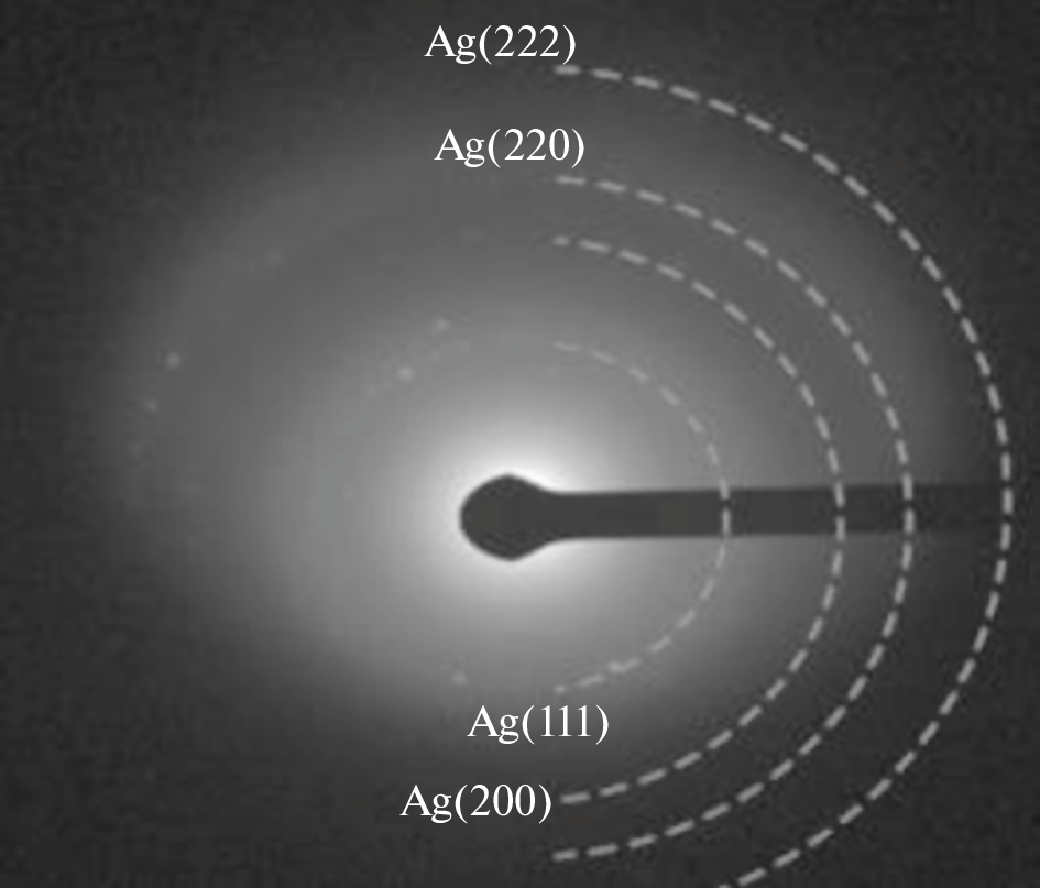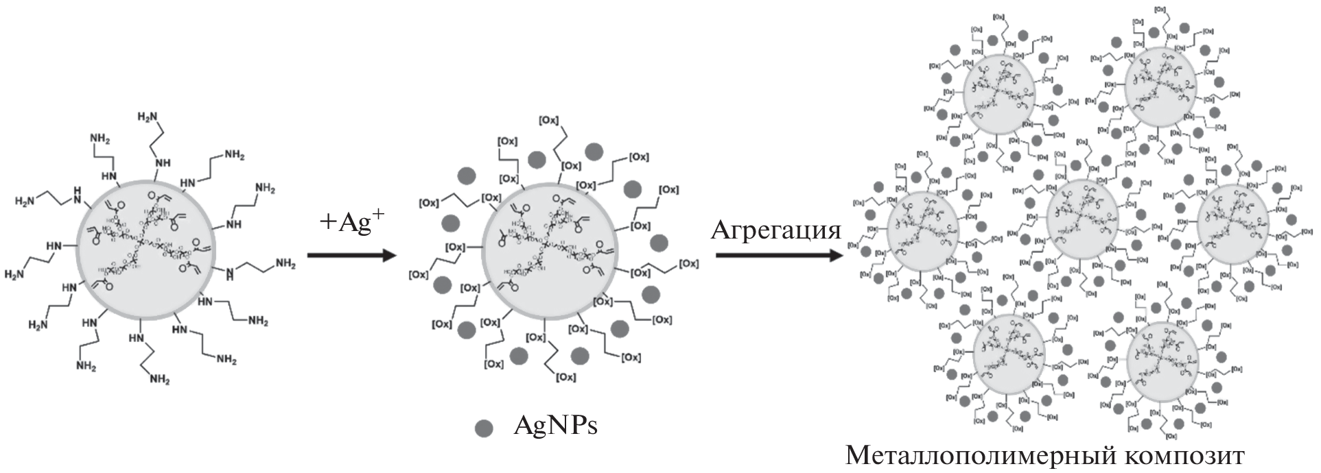 A procedure was developed for the single-step synthesis of a metal–polymer nanocomposite based on silver nanoparticles and second-pseudogeneration superbranched polyester functionalized along the periphery with 3-[(2-aminoethyl)amino]propionate. Under the conditions of the synthesis in the medium of H2O or DMSO, hyperbranched polyester decorated with ethylenediamine moieties can act as both a reductant of the nanoscale silver state and a stabilizer of it. The synthesized composite nanomaterial is formed by aggregates of hyperbranched polyester polyamine doped with Ag(0) nanoclusters and nanoparticles of spheroidal symmetry with a face-centered cubic crystal lattice. The hydrodynamic diameter of aggregates and the diameter of particles increase with increasing molar ratio