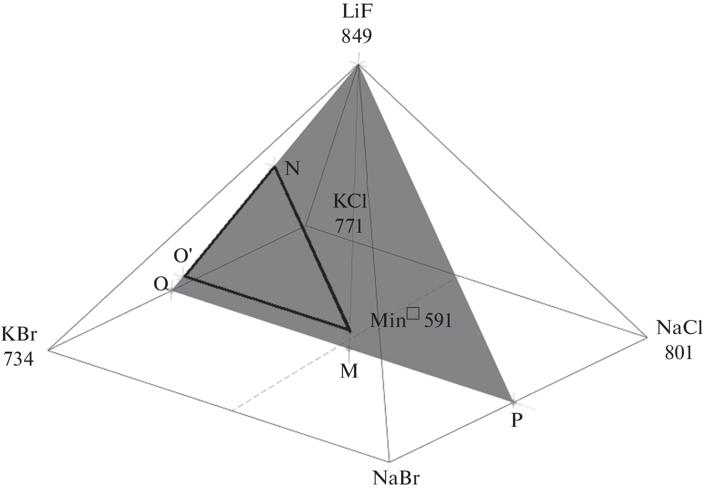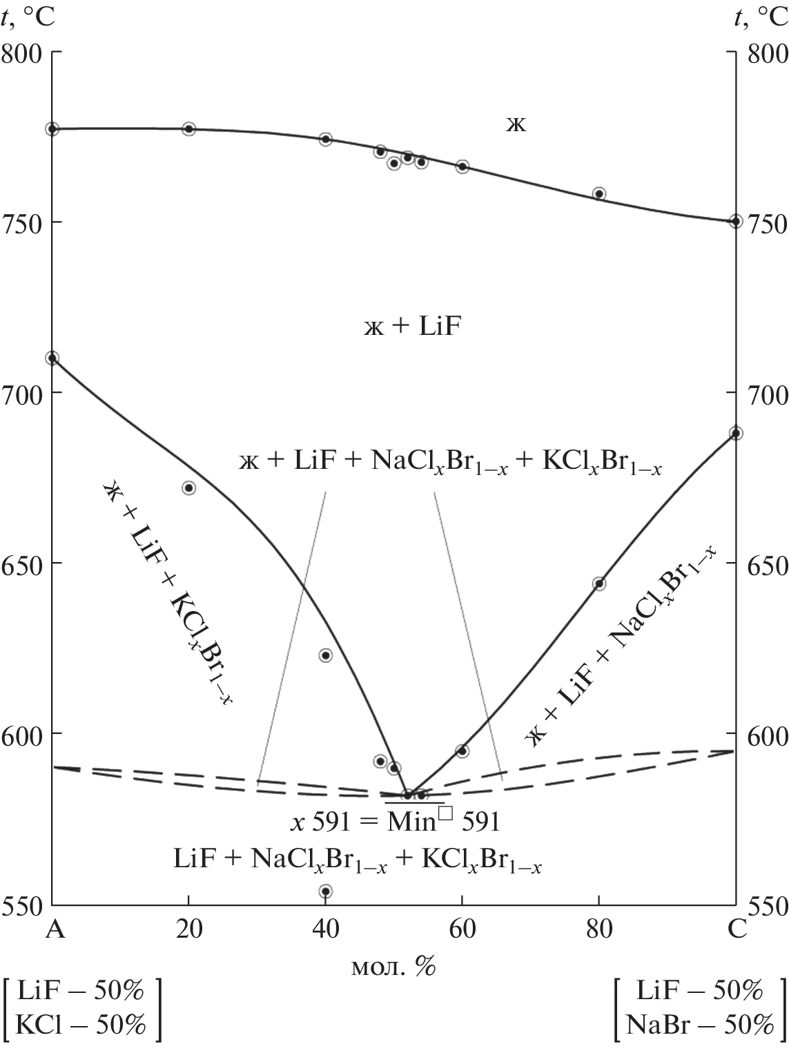 Впервые исследован фазовый комплекс пятикомпонентной взаимной системы Li+,Na+,K+||F–,Cl–,Br–. В результате разбиения фазового комплекса системы на стабильные элементы получено древо фаз, имеющее линейное строение и состоящее из стабильных пентатопа LiF–NaF–KF–KBr–KCl, гексатопа LiF–NaBr–NaCl–KCl–KBr–NaF, гептатопа NaCl–KCl–KBr–LiBr–LiCl–LiF–NaBr, соединенных стабильными тетраэдром LiF–NaF–KCl–KBr и квадратной пирамидой (пятивершинником) LiF–KBr–NaBr–NaCl–KCl. Методом дифференциального термического анализа изучены фазовые равновесия в стабильном пятивершиннике LiF–KCl–KBr–NaBr–NaCl. В пятивершиннике реализуется моновариантное фазовое равновесие: ж ⇄ LiF + NaClxBr1–x + KClyBr1–y, где NaClxBr1–x и KClyBr1–y – непрерывные ряды твердых растворов на основе NaCl и NaBr, KCl и KBr. Определены состав смеси точки Min◻ 591 и минимальная температура моновариантного равновесия. Построена компьютерная 3D-модель в виде проекции фазового комплекса на концентрационный пятивершинник LiF–KCl–KBr–NaBr–NaCl в программе КОМПАС 3D. Выделены объемы кристаллизующихся равновесных фаз.