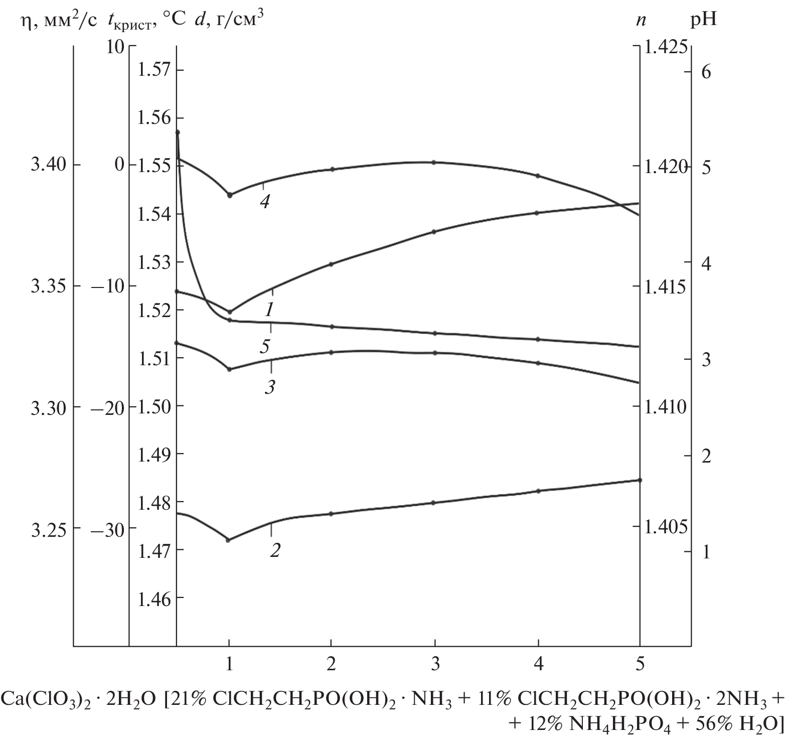 Изучено взаимное влияние компонентов в сложной водной системе, состоящей из хлората кальция, дигидрофосфата аммония и аммонийных солей хлорэтилфосфоновой кислоты. В интервале температур от –40.3 до 68.0°C построена политермическая диаграмма растворимости системы. На фазовой диаграмме растворимости системы разграничены поля кристаллизации льда, шести-, четырех-, двухводного хлората кальция и соединения состава NH4ClO3 · ClCH2CH2HPO3NH4. Соединение выделено из предполагаемой области кристаллизации и идентифицировано методами химического и физико-химического анализа. С целью обоснования процесса получения эффективного стимулятора и мягко действующего дефолианта на основе хлората кальция и препарата “Нажот” изучены реологические свойства компонентов в системе Ca(ClO3)2–[21% ClCH2CH2PO(OH)2 ⋅ NH3 + 11% ClCH2CH2PO(OH)2 ⋅ 2NH3 + 12% NH4H2PO4 + 56% H2O]–H2O. Построена диаграмма состав–свойство системы.