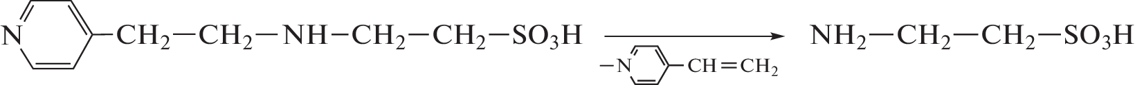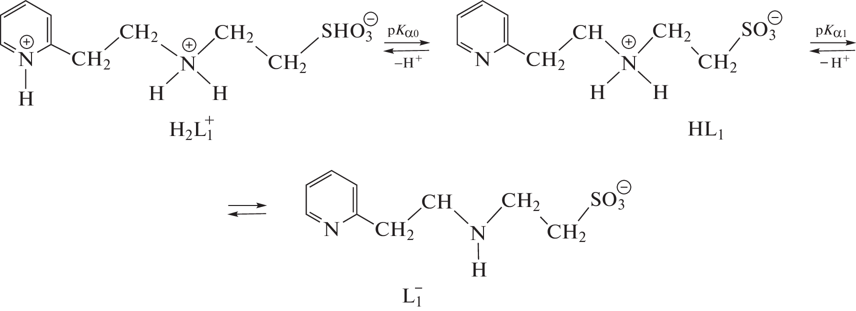 New N-derivatives of taurine, N-[2-(2-pyridyl)ethyl]taurine (HL1) and N-[2-(4-pyridyl)ethyl]taurine (HL2) have been synthesized. Using the method of alkalimetric titration of aqueous solutions with pH potentiometric indication at I = 0.1 mol/L (KCl/KNO3) and T = 25 ± 1°C, the acid dissociation constants of functional groups in the composition of reagents have been determined (HL1: pKa0 = 3.80 ± 0.03, pKa1 = 8.67 ± 0.02, HL2: pKa0 = 4.80 ± 0.05, pKa1 = 8.18 ± 0.04). It has been found that reagent HL1 is more resistant to the degradation process. The complexation of transition and alkaline earth metal ions with НL1 has been studied. It has been shown that the introduction of a 2-(2-pyridyl)ethyl substituent into the structure of taurine leads to a significant increase in the stability (Δ log β ≥ 1) of copper(II), cobalt(II), nickel(II), zinc(II), cadmium(II) and silver(I) complexes with НL1. Calcium(II), magnesium(II), strontium(II), and barium(II) complexes with HL1 are characterized by a slight increase in stability (Δ lg β < 1) compared to taurine. Based on the data obtained, the structure of the studied complexes have been assumed.