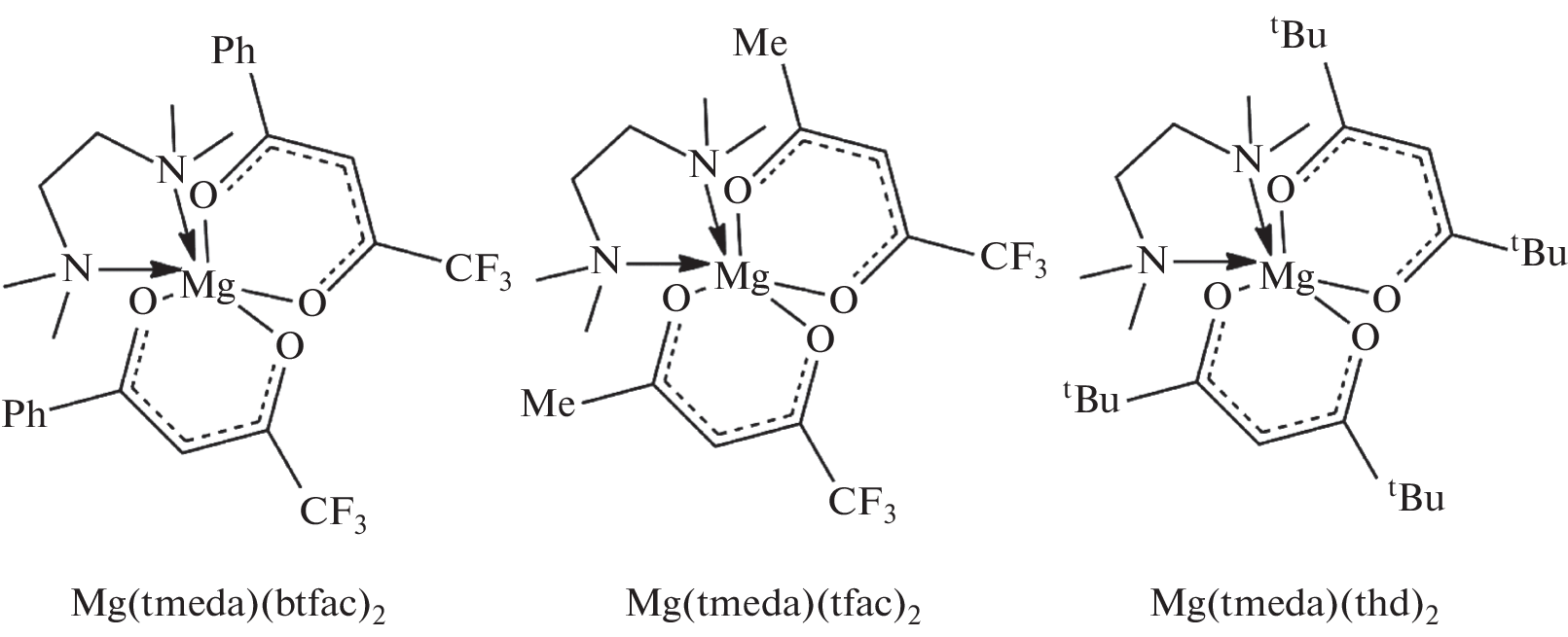= 163 ± 6 kJ/mol, ΔsublS427 = 293 ± 14 J/(mol K)). The substance passes into the gas phase with partial decomposition. Thermodynamic modeling of the composition of condensed phases formed from Mg(tmeda)(btfac)2 with the addition of H2 or O2 has been performed depending on the temperature (700–1300 K), total pressure (133–13 332 Pa), and the ratio of the reagent gas to the precursor (0–300). The data obtained can be used to determine the experimental parameters of the processes for obtaining functional layers. Comparison of the results with a similar trifluoroacetylacetonate complex made it possible to quantitatively reveal the effect of replacing the methyl group in the anionic ligand with a phenyl one.