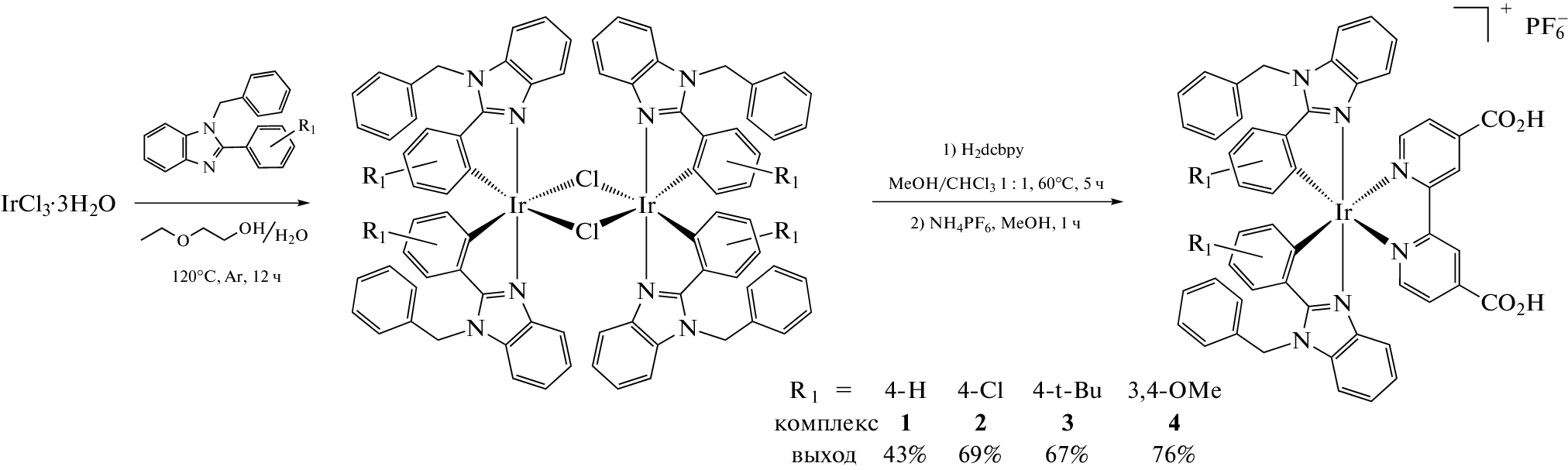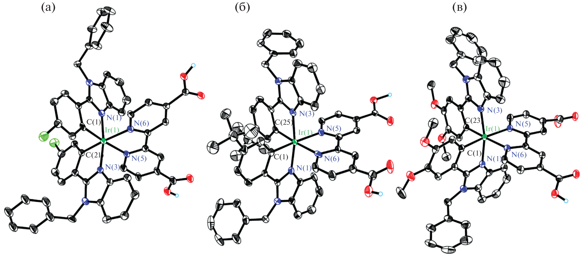 A series of bis-cyclometallated iridium(III) complexes with various 2-aryl-1-benzylbenzimidazoles (aryl is 4-chlorophenyl, 4-tert-butylphenyl, 3,4-dimethoxyphenyl) and 4,4'-dicarboxy-2,2'-bipyridine have been prepared. The synthesized complexes have been studied by 1H NMR spectroscopy, high-resolution mass spectrometry, X-ray diffraction analysis, spectrophotometry, luminescent spectroscopy, and cyclic voltammetry. In the electronic spectra of the complexes, the absorption bands show a noticeable bathochromic shift with an increase in the electron-donating properties of the benzimidazole ligand. In solution, the complexes exhibit photoluminescence in the yellow–red region of the spectrum with a quantum yield in the range of 0.4–7.7% and an excited state lifetime in the range of 71–408 ns. According to cyclic voltammetry data, quasi-reversible redox transitions are observed in solutions of the studied complexes (Eox = 1.16–1.57 V vs. SHE, acetonitrile).