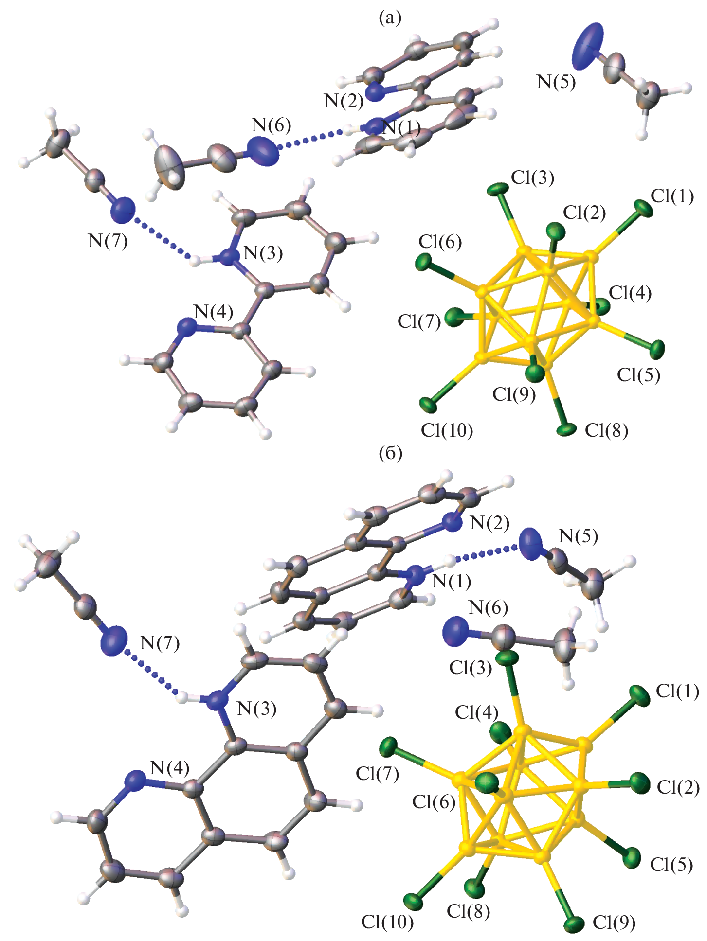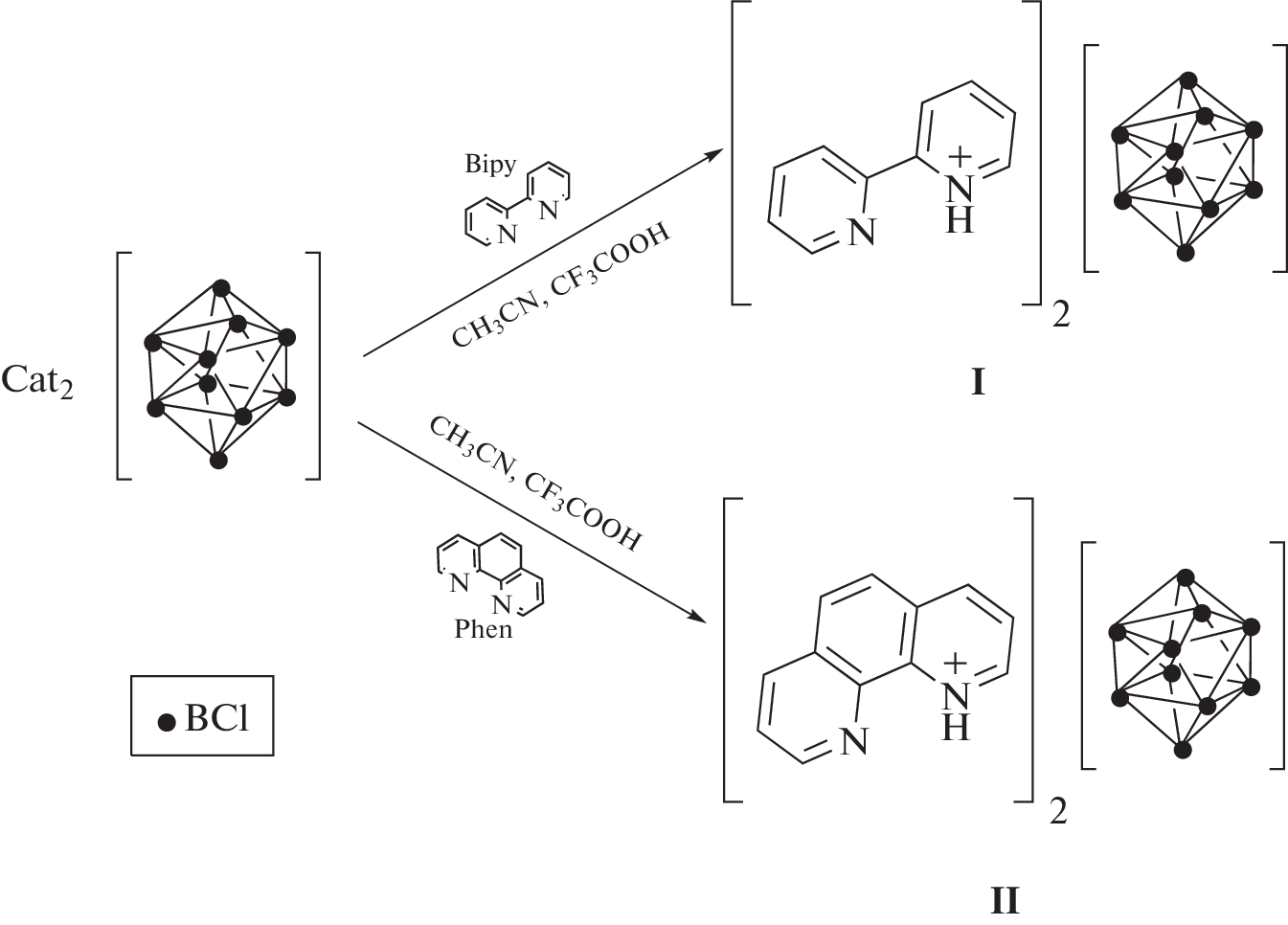 Reactions of (Et3NH)2[B10Cl10] and organic ligands 2,2'-bipyridyl (Bipy) and 1,10-phenanthroline (Phen) in the acetonitrile–trifluoroacetic acid system have yielded compounds of composition (HL)2[B10Cl10]·3CH3CN (L = Bipy, Phen). The compounds have been characterized by IR spectroscopy, elemental analysis, and X-ray diffraction (CCDC nos. 2224377 and 2224378). It has been shown that in the presence of trifluoroacetic acid, protonation of organic ligands occurs with the formation of bipyridylium and phenanthrolinium salts, which are stabilized by the decachloro-closo-decaborate anion. It has been found that the cations participate in the formation of hydrogen bonds with the solvate molecules of acetonitrile, while only weak C–H…Cl and B–Cl…π interactions are observed for boron cluster anions.