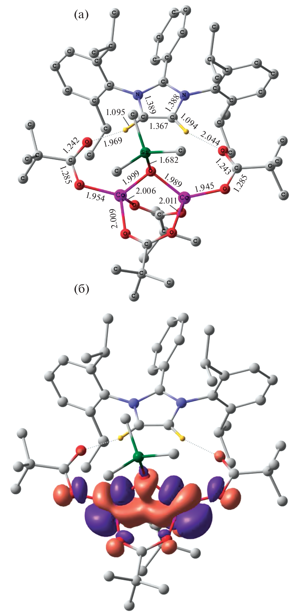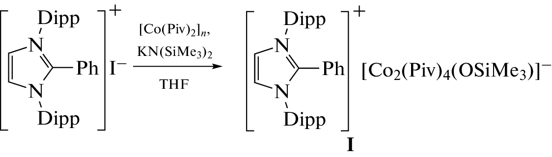 The heteroleptic anionic complex (IPrPhH)[Co2(μ-Piv)2(μ-OSiMe3)(Piv)2] (I) was synthesized through the reaction of cobalt pivalate [Co(Piv)2]n with 1,3-bis(2,6-diisopropylphenyl)-2-phenylimidazolium iodide ([IPrPhH]I) and KN(SiMe3)2 and studied by X-ray diffraction both in the solvate-free form and in the form of solvate with pentane (I⋅0.75C5H12) (CCDC 2257678–2257679). Modeling of the probable mechanism of formation of complex I and evaluation of exchange coupling between paramagnetic centers in it were carried out by density functional theory method.