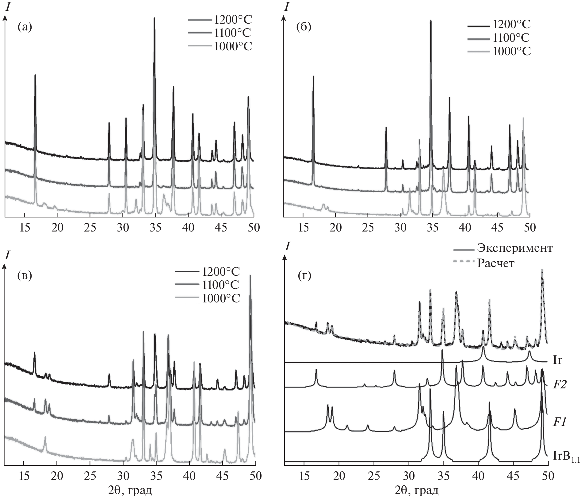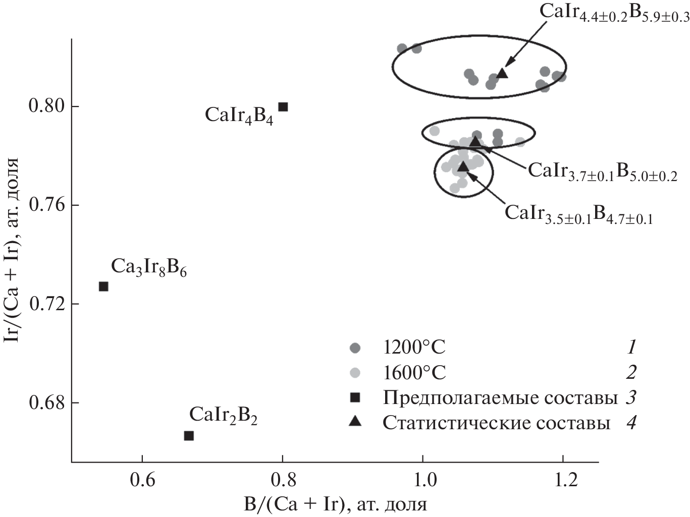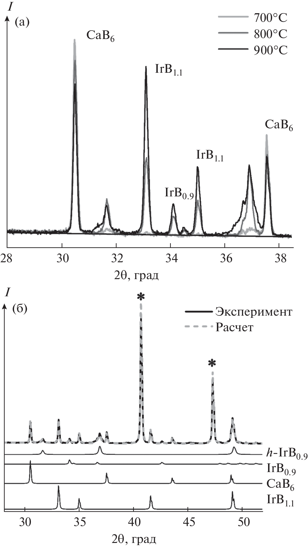 The processes occurring in the Ca–Ir–B system were studied. The elemental and phase compositions and morphology of the products formed in the reaction of iridium metal with calcium hexaboride in the 700–1600°C temperature range were investigated. The signs of the onset of the reaction are already visible at 700°C. The first reaction products are iridium borides IrB0.9 and IrB1.1, where IrB0.9 is formed as a low-temperature and metastable high-temperature polymorphs. An increase in the treatment temperature in the 1000–1600°C range leads to the formation of three ternary compounds, presumably, Ca3Ir8B6, CaIr4B4, and CaIr2B2; the first two of these phases were previously unknown. The unit cell parameters of the new compounds, Ca3Ir8B6 (based on Sr3Rh8B6) and CaIr4B4 (based on LaIr4B4), were determined. The results attest to the complexity of the processes occurring in the Ca–Ir–B system and the diversity of ternary boride phases. The ternary boride phases can be of interest by themselves for high-temperature materials science.