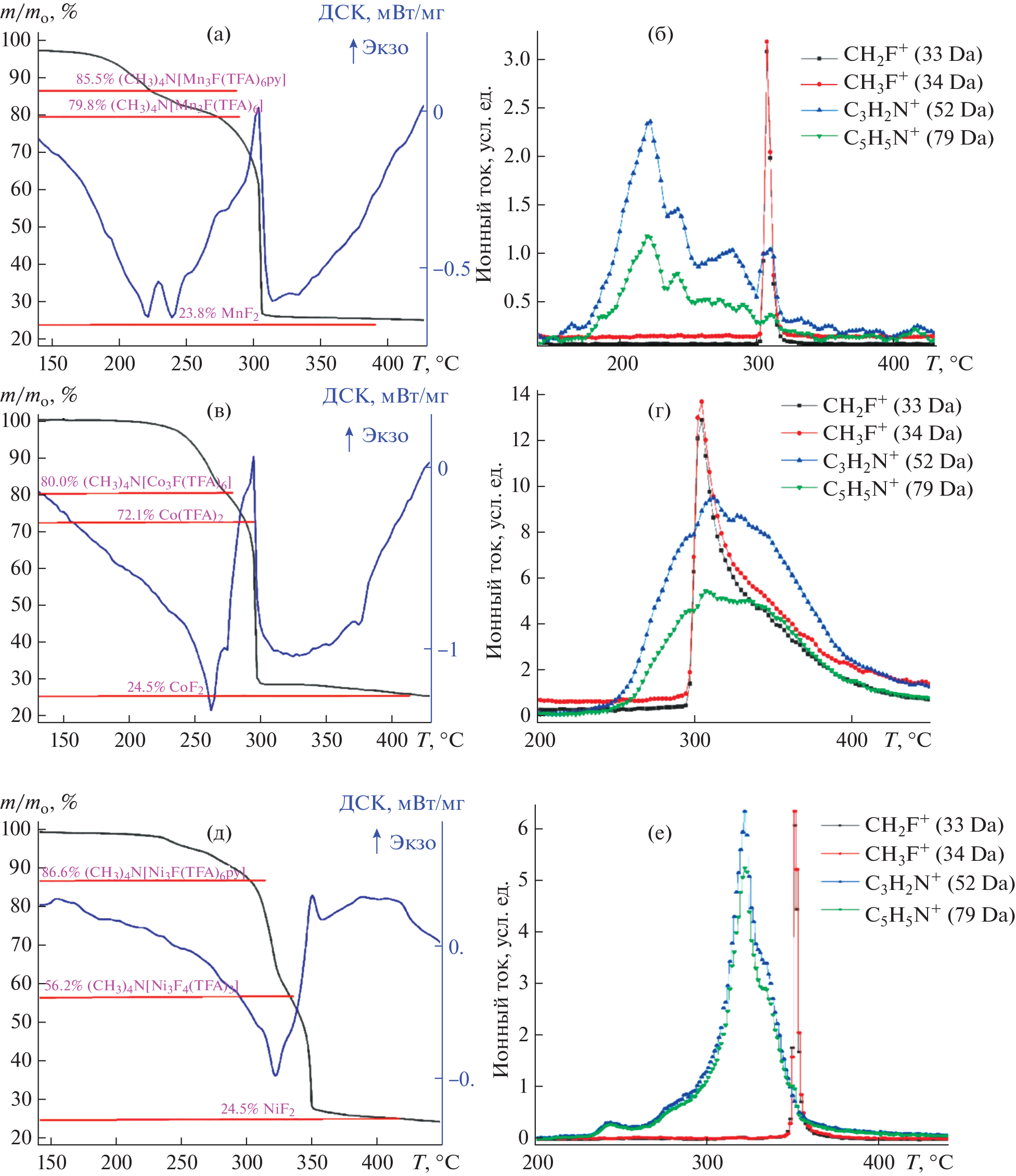 Trinuclear complexes Me4N[Ni3(µ3-F)(TFA)6(MeOH)2(H2O)] (1) and Me4N[M3(μ3-F)(TFA)6(py)3] (M = Mn (2), Co (3), Ni (4), Cu (5), Zn (6)) have been synthesized by crystallization from methanol solutions. Single-crystal X-ray diffraction shows that compounds 1–6 are composed of tetramethylammonium cations Me4N+ and trinuclear triangular anions [Ni3(µ3-F)(TFA)6(MeOH)2(H2O)]– (1) or [M3(μ3-F)(TFA)6(py)3]– (2–6) centered by the μ3-F atom. The bridging trifluoroacetate anions (TFA–) located along the triangle edges link pairs of M2+ cations, and the axial positions are occupied by MeOH, H2O, or pyridine (py) molecules. In 2, the pyridine molecules are nearly coplanar with the [M3F] triangle, while in the other structures they are turned almost perpendicularly. The different orientations of py molecules lead to different packing motifs: columns of alternating trinuclear anions and Me4N+ cations are formed in 2, while in 3–6 anions and cations form neutral layers. A significant role in the organization of structures 1–6 is played by non-covalent interactions, such as hydrogen bonds and stacking and CH···π interactions. Heating complexes 2–4 above 200°С turns out to lead to a stepwise thermal decomposition, which begins with the elimination of py and ends with the formation of d-metal fluoride above 300°С.