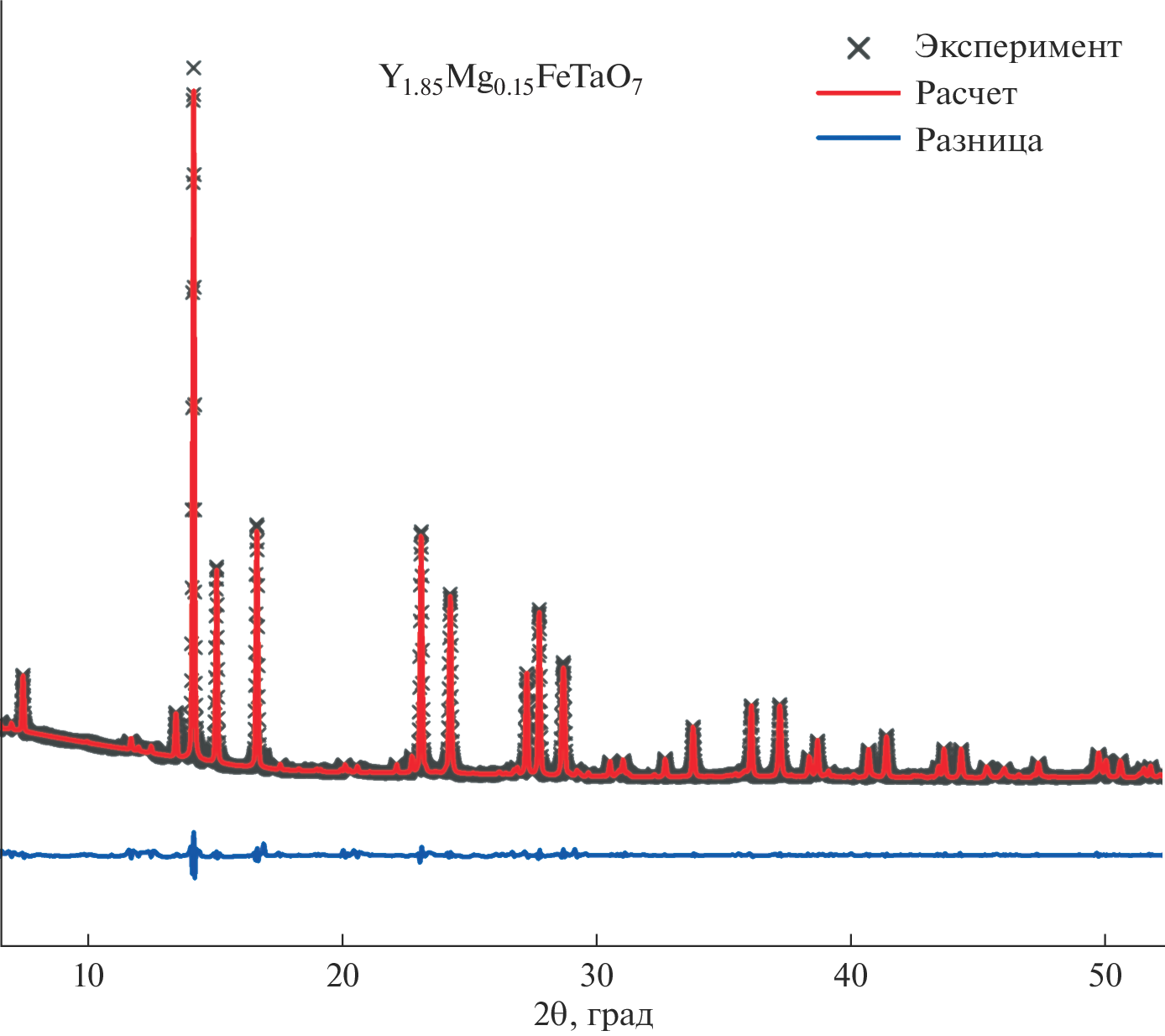 Mg-containing solid solutions based on Y2FeTaO7 and formed by various mechanisms of heterovalent substitution were synthesized and had the following compositions: Y2Fe0.55Mg0.3Ta1.15O7, Y2Fe0.625Mg0.3Ta1.075O7, Y2Fe0.7Mg0.3TaO7, Y2Fe0.7Mg0.2Ta1.1O7, Y2Fe0.85Mg0.15TaO7, Y1.85Mg0.15Fe0.925Ta1.075O7, and Y1.85Mg0.15FeTaO7. It was shown that all synthesized solid solutions have a pyrochlore-like layered structure (space group P3121), in which Fe3+ ions are distributed over three structural positions. The magnetic properties of these solid solutions are due to the presence of a small ferromagnetic component in a predominantly antiferromagnetic system and characterize a ferrimagnet or a canted antiferromagnet with the Néel transition at the Néel temperature TN above room temperature. According to the data of magnetic measurements, two magnetic phase transitions to the ordered phase occur in all the studied samples. Along with the TN transition, in weak magnetic fields and below TN, there is a second transition, which is most likely due to a spin reorientation of the Morin type. The existence of magnetic ordering at room temperature in one magnetic sublattice or an internal magnetic field (Hin) was confirmed by Mössbauer spectroscopy.