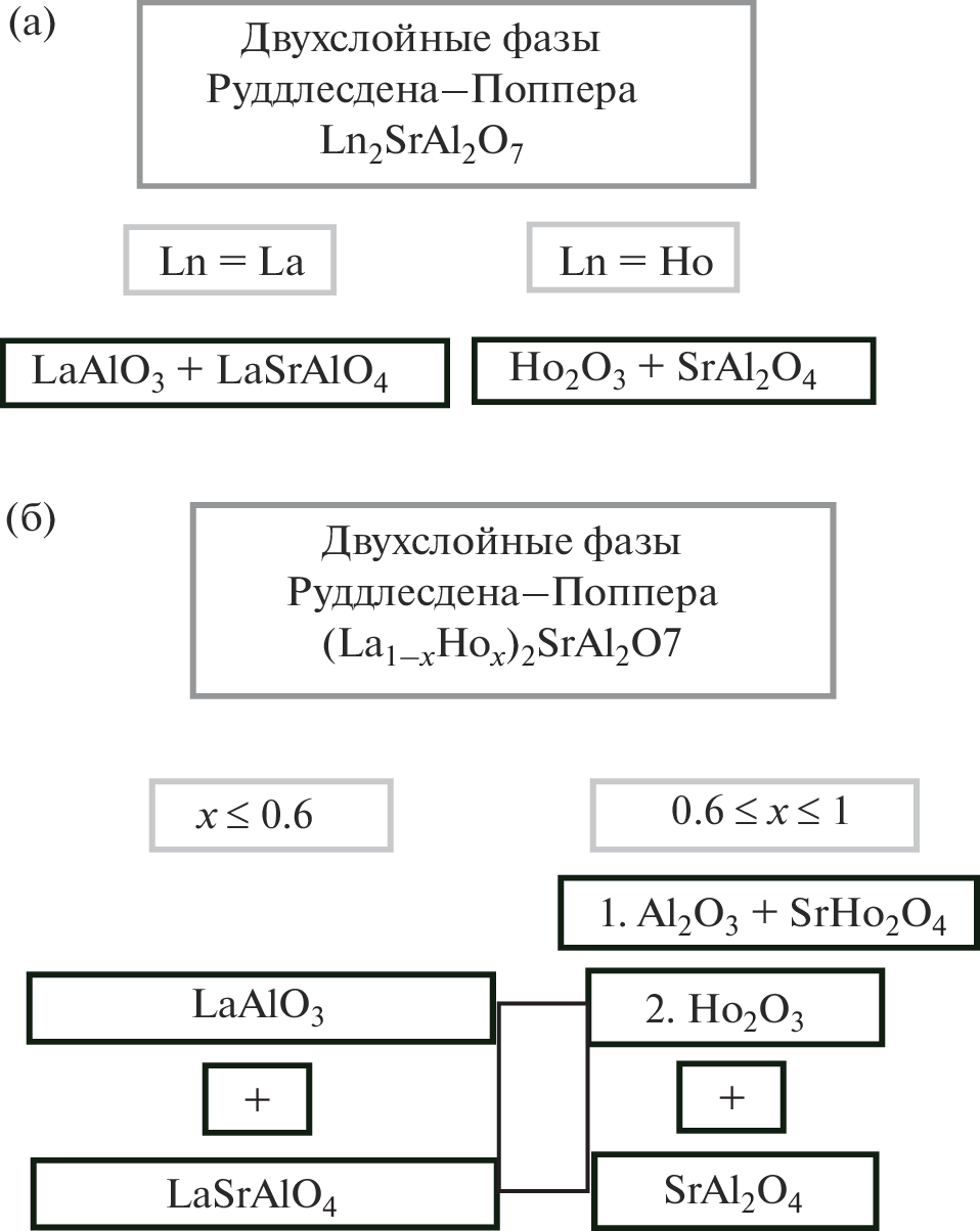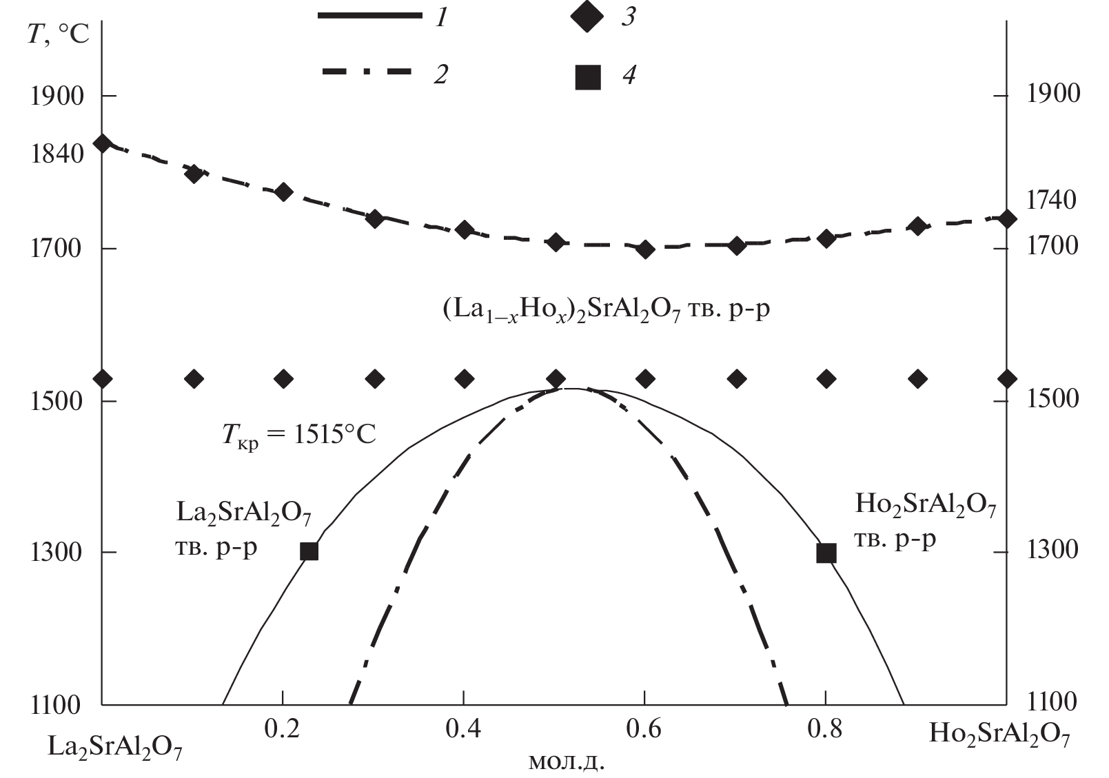 Continuous solid solutions of two-layer (La1 – xHox)2SrAl2O7 aluninates, which are Ruddlesden–Popper phases, have been found to exist in the La2SrAl2O7–Ho2SrAl2O7 system at temperatures above 1515°С. The (La1 – xHox)2SrAl2O7 complex aluminates crystallize in tetragonal crystal system (space group I4/mmm). A phase transformation scheme has been proposed for the La2SrAl2O7–Ho2SrAl2O7 system with the unlimited mutual solubility of the components at high temperatures and with a decomposition area below the critical temperature Тcr = 1515°С.