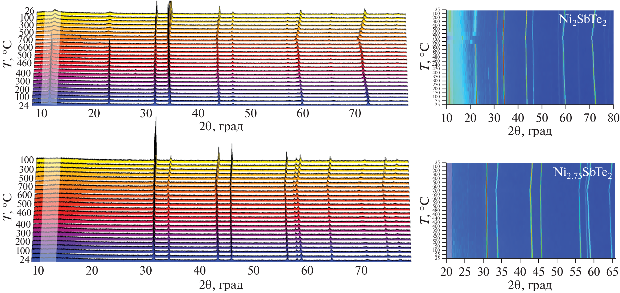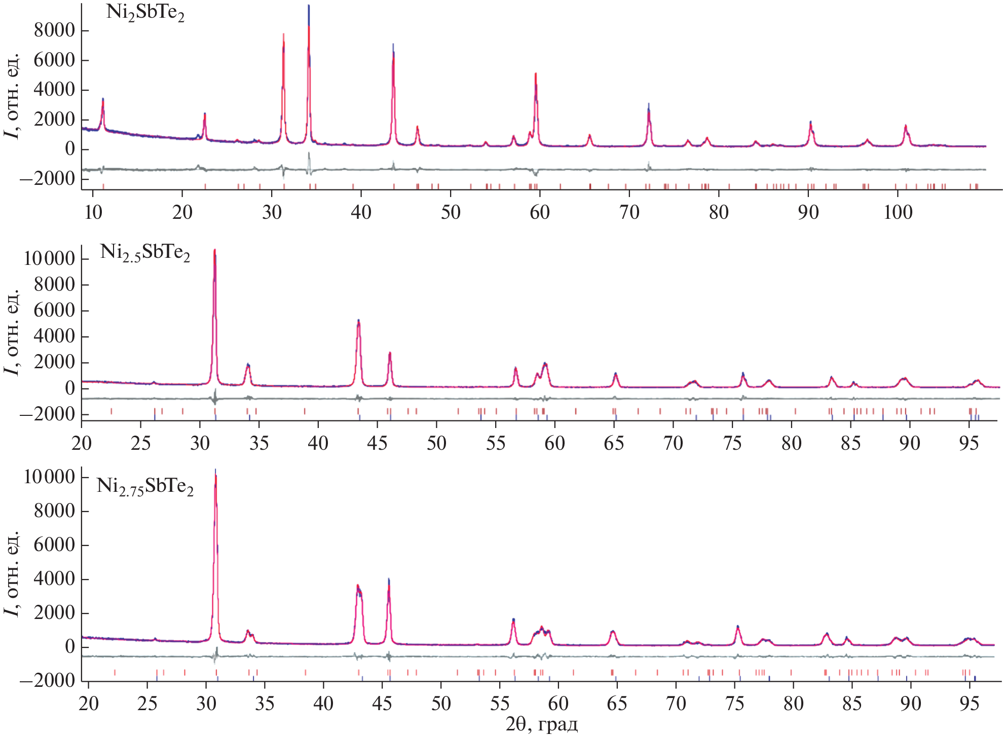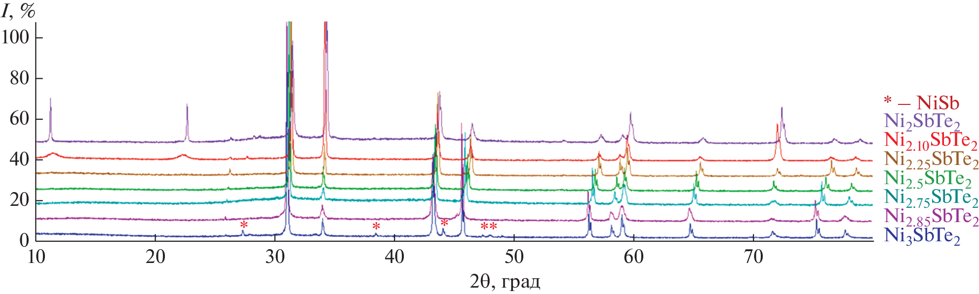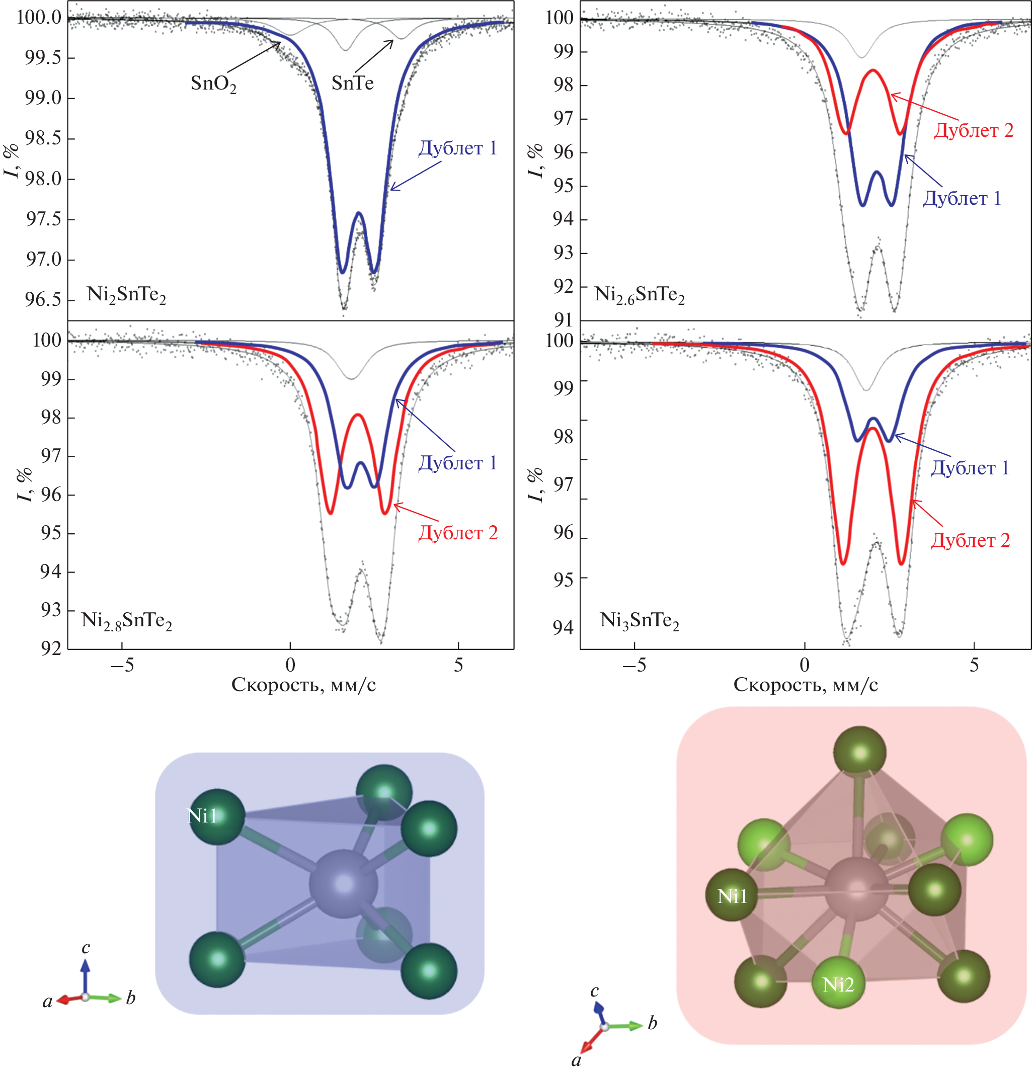 Высокотемпературным ампульным синтезом получены серии соединений Ni3 – xMTe2 (M = Sb, Sn; x = 0–1), которые охарактеризованы методами порошковой рентгеновской дифракции и мессбауэровской спектроскопии на ядрах 121Sb и 119Sn. Показано, что для Ni3 – хSnTe2 никель при изменении х от 1 до 0 распределяется по трем возможным позициям, две из которых дают суммарную заселенность, равную 1, и имеют упорядоченные вакансии, в то время как для Ni3 – хSbTe2 при х, отличном от ~0.9–1.0, упорядочение вакансий пропадает. Установлена температурная зависимость наличия или отсутствия упорядочения вакансий для Ni2SbTe2, которое пропадает при нагреве выше 600°С и вновь наблюдается при охлаждении.