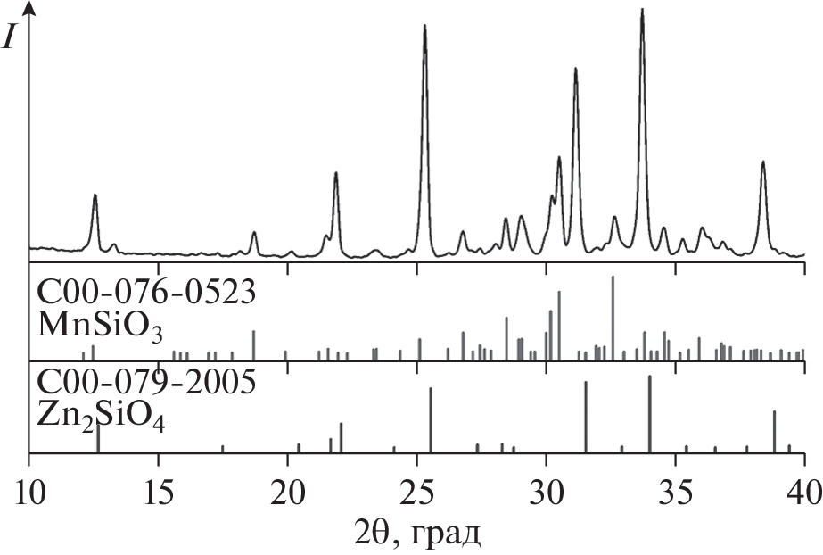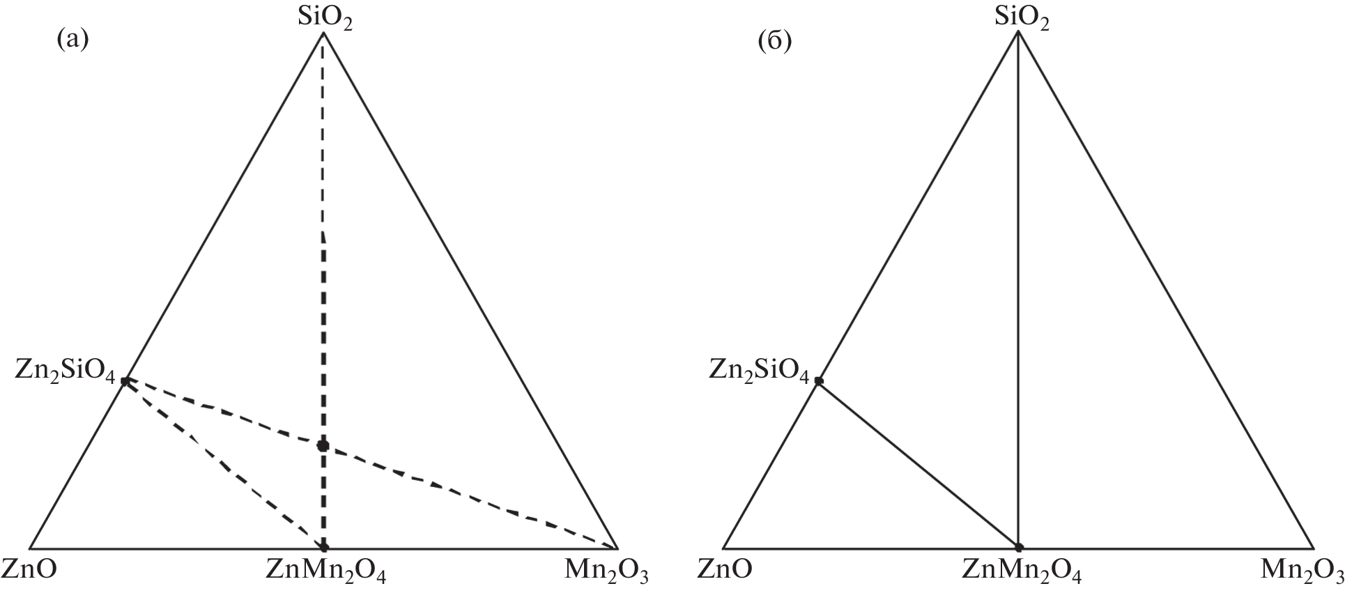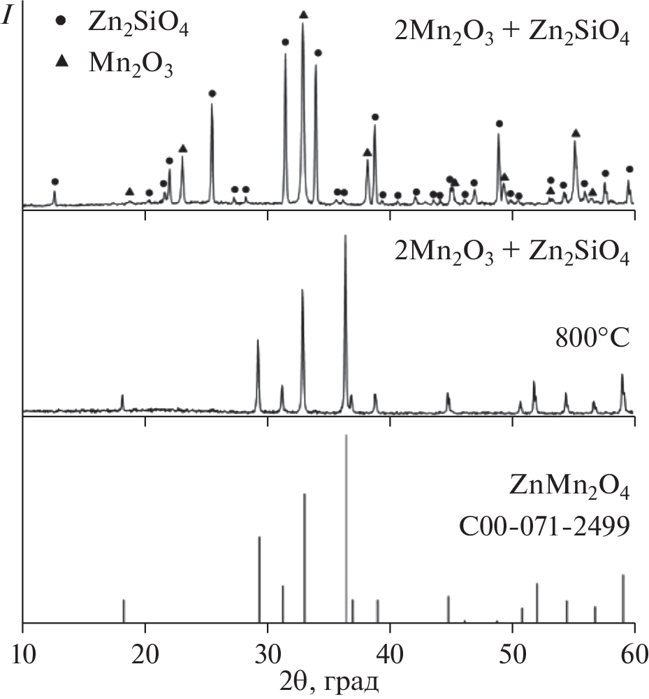 The subject matter of this work was the triangulation of the Mn2O3–ZnO–SiO2, Mn3O4–ZnO–SiO2, and MnO–ZnO–SiO2 systems and the determination of phase transformations to yield Zn2 – 2хMn2хSiO4 solid solution. Equilibrium phase diagrams have been plotted taking into account the existence temperatures of each of the manganese oxides, phase compositions of the constituent binary systems, and checkup points, whose phase compositions helped us to determine the positions of secondary triangles. The phase compositions of reaction products of the terminal oxides and the phase transformation sequence during Zn2 – 2хMn2хSiO4 synthesis were monitored by X-ray powder diffraction and thermal analysis. Phase ratios in the MnOх–ZnO–SiO2 system are caused by the charge states of manganese ions changing in response to rising temperature. The triangulation of the Mn2O3–ZnO–SiO2 system at 800°С is determined by the ZnMn2O4–Zn2SiO4 tie-line and partitions the system to the ZnO–Zn2SiO4–ZnMn2O4, Zn2SiO4–ZnMn2O4–SiO2, and ZnMn2O4–SiO2–Mn2O3 simplex triangles. The Zn2 – 2хMn2хSiO4 solid solution with an extent limited to Zn1.6Mn0.4SiO4 is formed at temperatures above 1000°С. The triangulation of the MnO–ZnO–SiO2 ternary system is determined by the Zn1.6Mn0.4SiO4–ZnO–MnSiO3 simplex triangle.