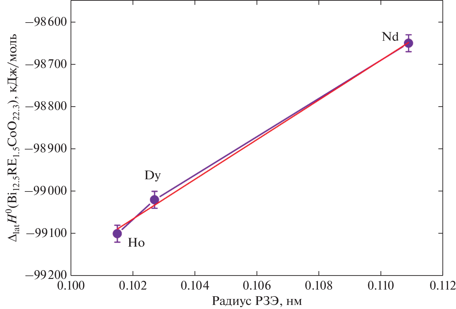 m) with the unit cell parameter a = 0.55279(5) nm. The solution enthalpy and standard enthalpy of formation of Bi12.5Dy1.5CoO22.325 have been measured by solution calorimetry: ΔsolH0 = −1017.0 ± 7.5 kJ/mol, and ΔfH0 = −5338.8 ± 19.9 kJ/mol. The lattice enthalpy has been calculated using the Born–Haber cycle: ΔlatH0 = −99020 kJ/mol. The lattice enthalpy increases in magnitude as the lanthanide radius decreases in the neodymium–dysprosium–holmium series.