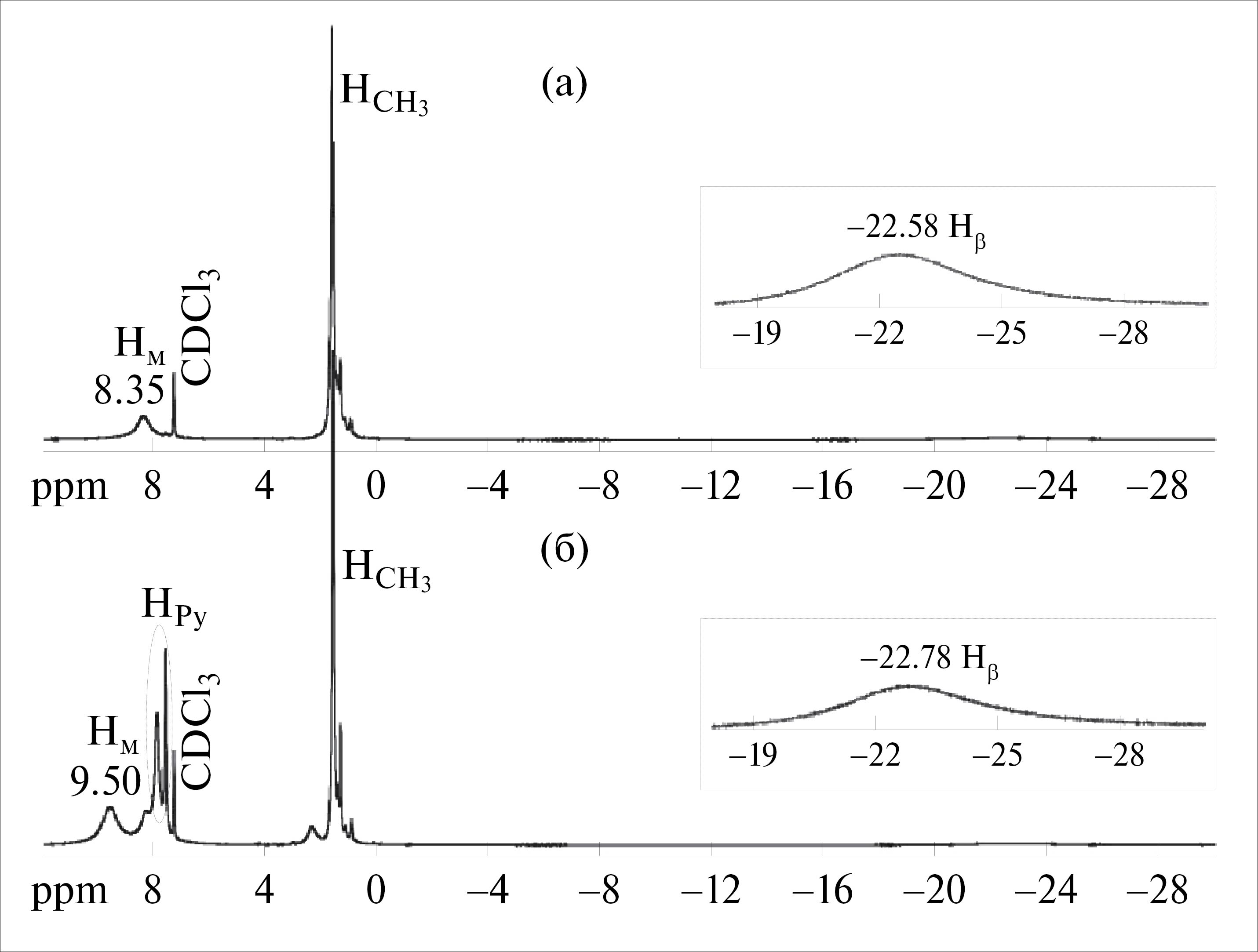 Рис. 5. 1Н ЯМР-спектры (AcO)MnTtВuPP (а) и (AcO)(Py)MnTtВuPP (б) в CDCl3.