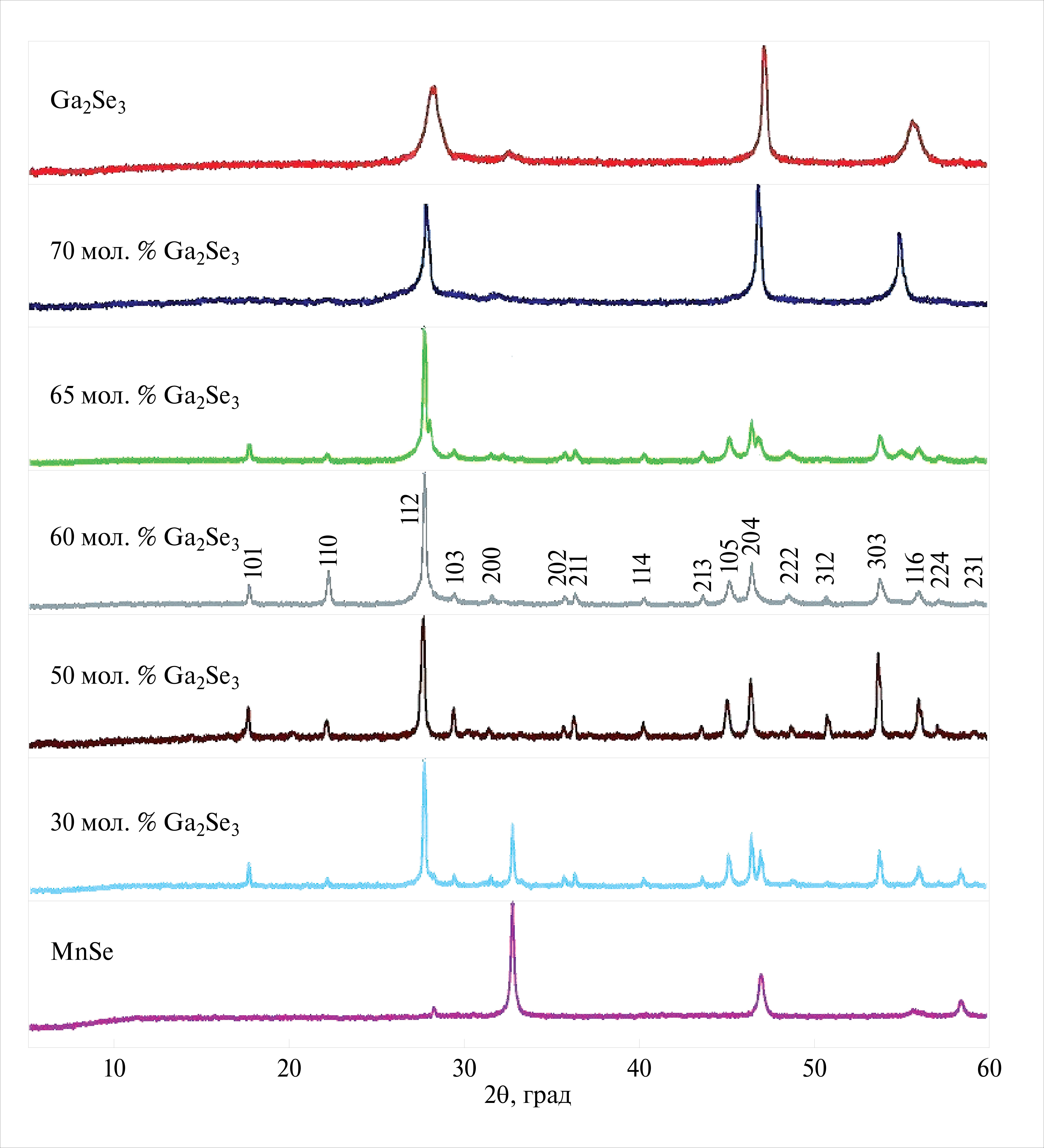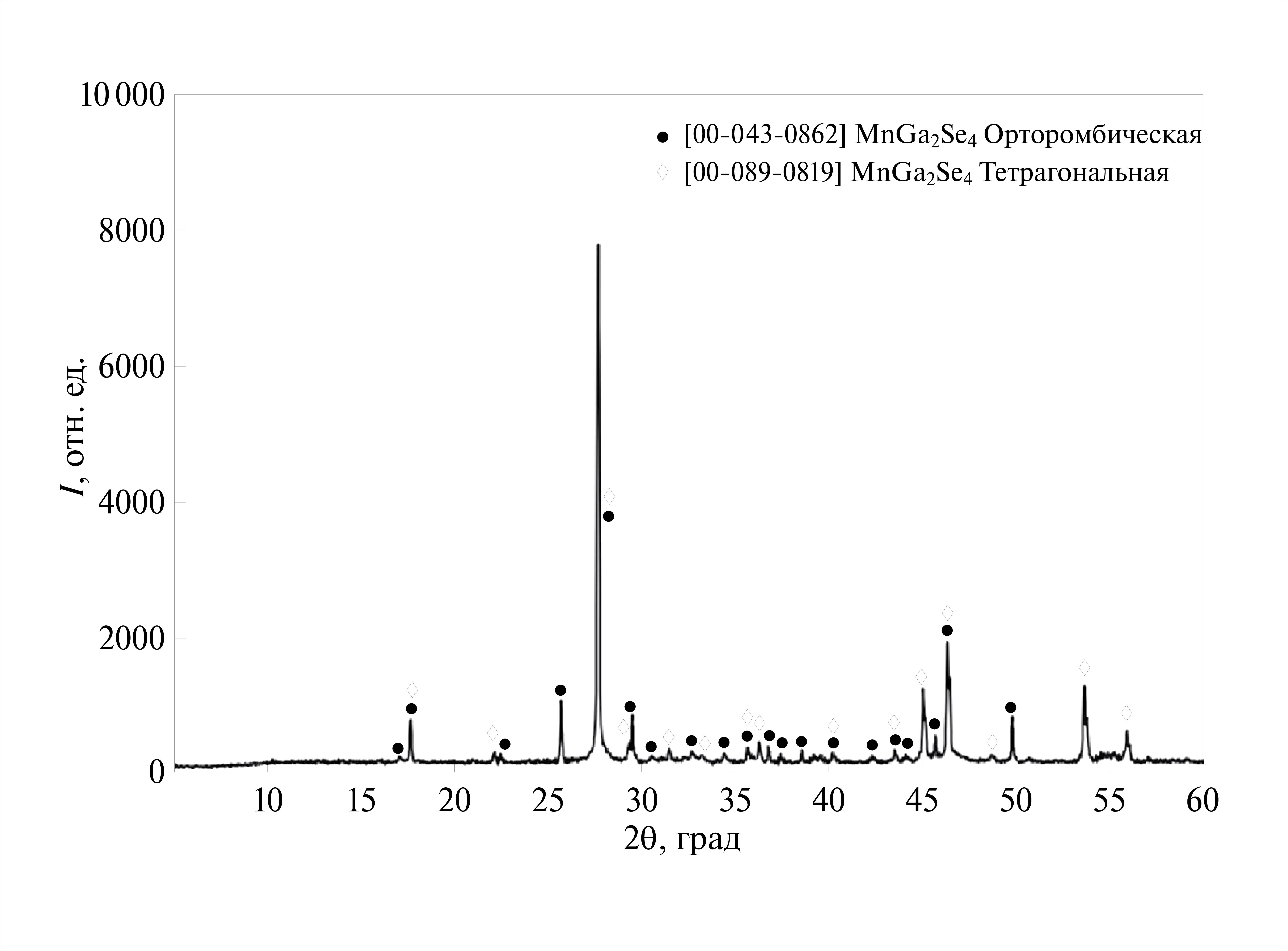 Синтез. Исходные соединения MnSе и Ga2Se3 синтезировали сплавлением стехиометрических количеств элементарных компонентов высокой степени чистоты (марганец, номер по каталогу 7439-96-5, галлий — 7440-55-3, селен — 7782-49-2) компании Alfa Aesar в откачанных до ~10–2 Па и запаянных ампулах из кварцевого стекла с последующим медленным охлаждением в выключенной печи. Во избежание взаимодействия кварца с марганцем синтез MnSе проводили в графитизированных ампулах.