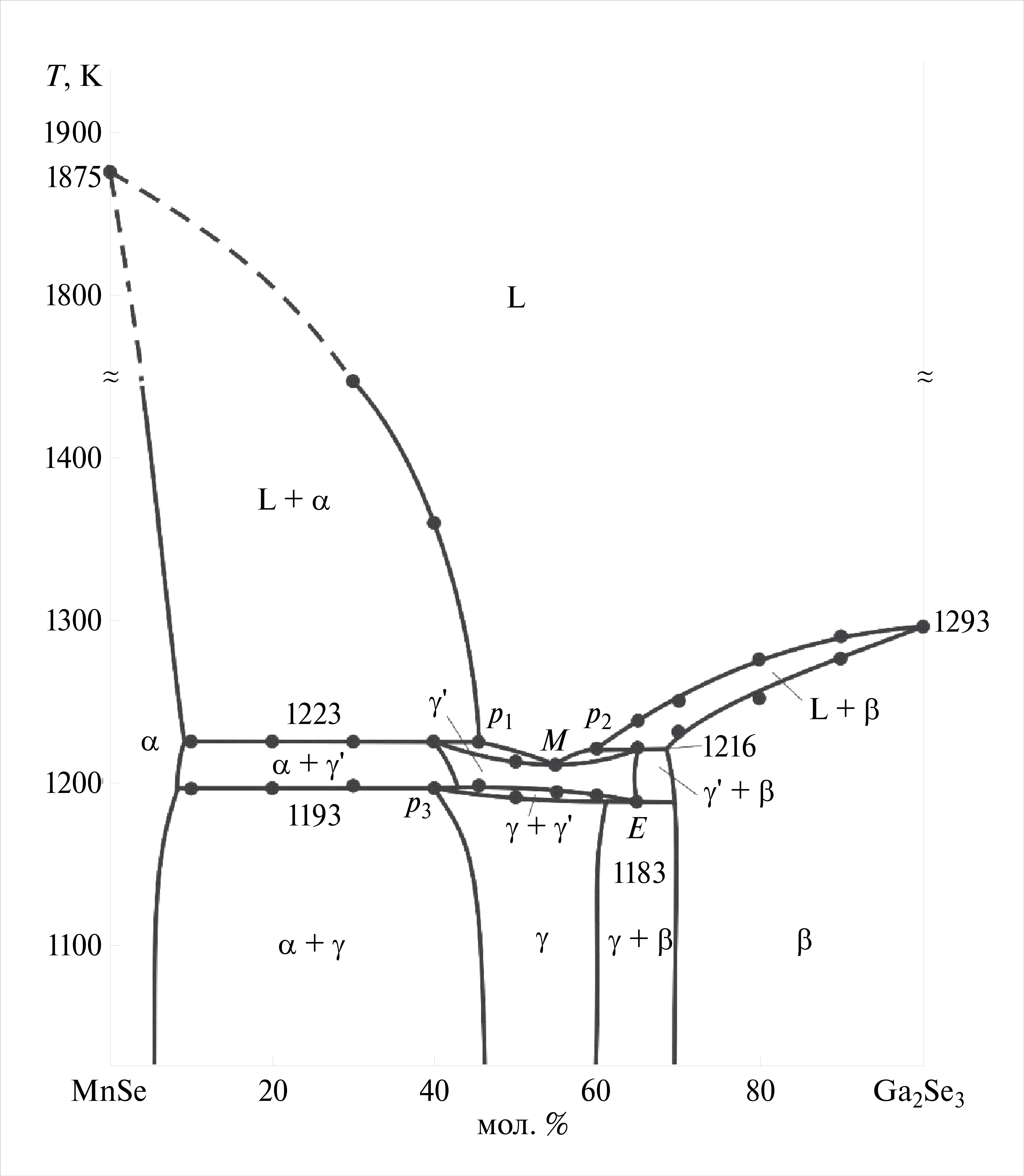 Ранее с целью поиска и разработки физико-химических основ создания новых магнитных полупроводников нами были предприняты исследования фазовых равновесий в системах MX–Ga2X3–In2X3 (M = Mn, Fe; X = S, Se, Te) [35–39]. Наши предварительные экспериментальные результаты, полученные при исследовании системы MnSe–Ga2Se3–In2Se3, выявили их несоответствие с известными вариантами [40, 41] фазовой диаграммы граничной системы MnSe–Ga2Se3. В связи с этим целью настоящей работы явилось получение новой уточненной картины фазовых равновесий в системе MnSe–Ga2Se3.