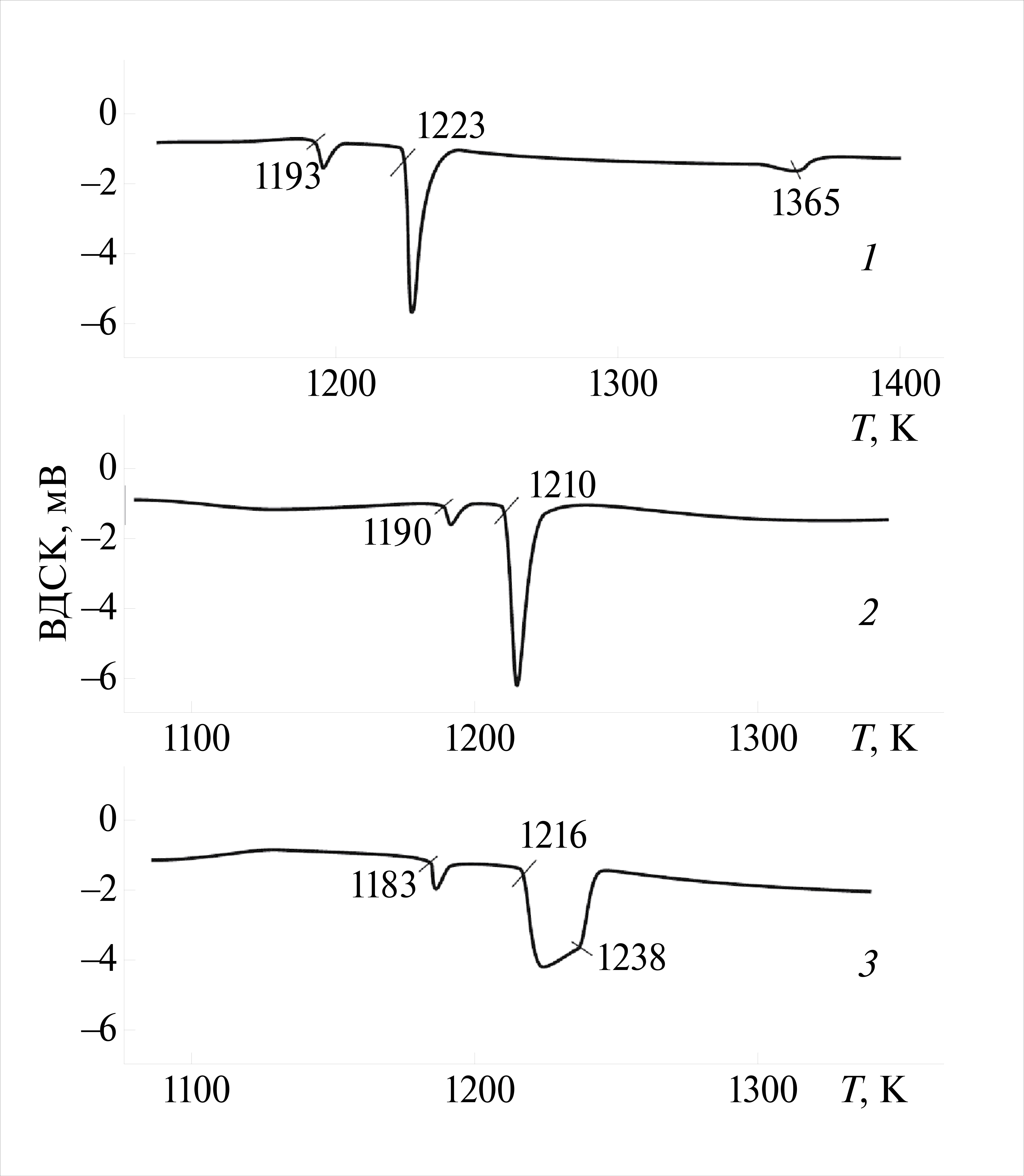 Методы исследования. Исследования проводили методами дифференциального термического (ДТА) и рентгенофазового анализа (РФА). ДТА образцов массой 0.1–0.3 г проводили в ваккумированных кварцевых ампулах на установке Netzsch STA 449 F3 (платинородиевые термопары) в интервале температур от комнатной до ~1450 K со скоростью нагревания 10 град/мин.