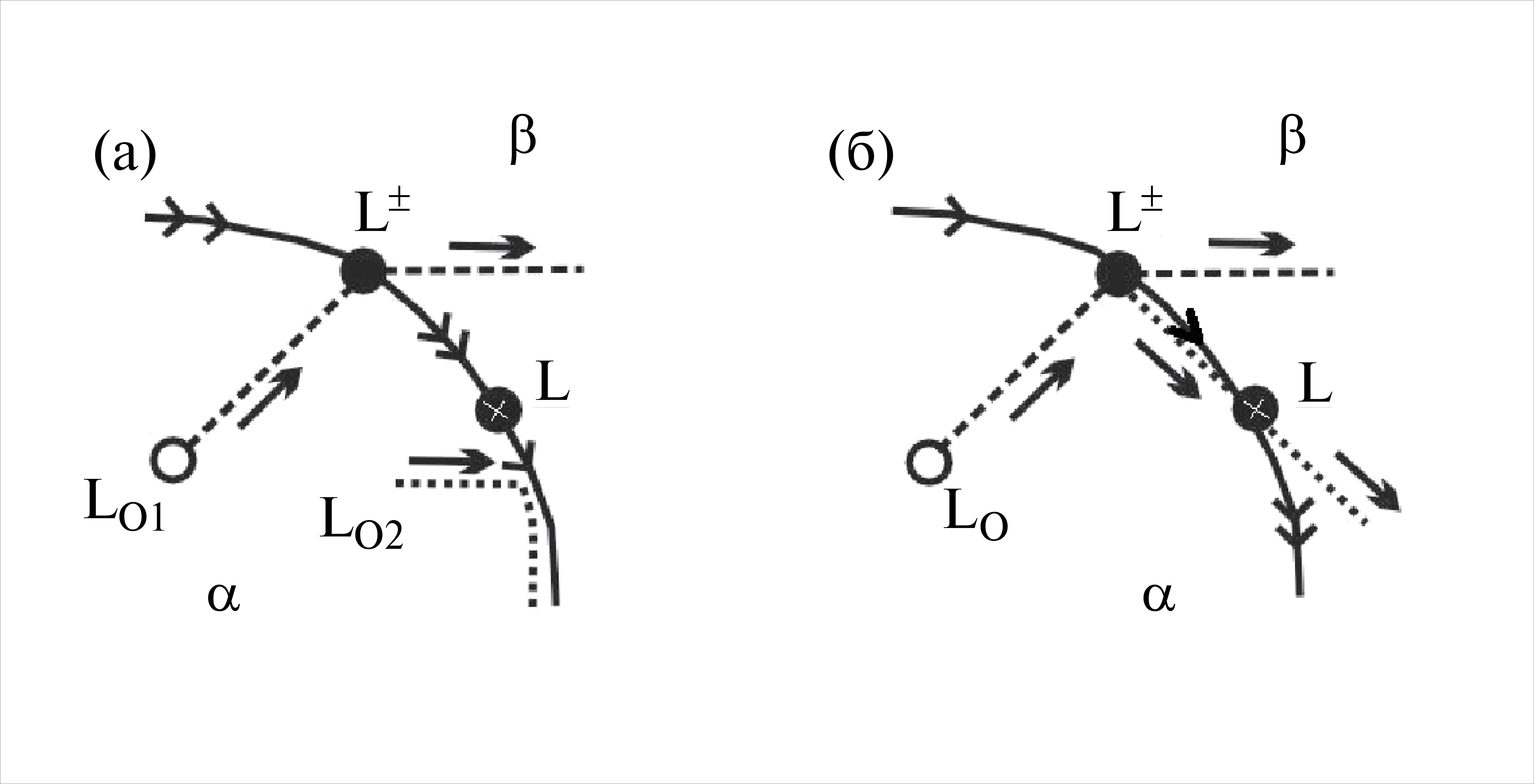 Рис. 3. Моновариантная линия с переходной точкой L на линии между областями первичной кристаллизации фаз á и â и траектории состава расплава при направленной кристаллизации; а — перитектическая складка переходит в эвтектическую, б — эвтектическая складка переходит в перитектическую.